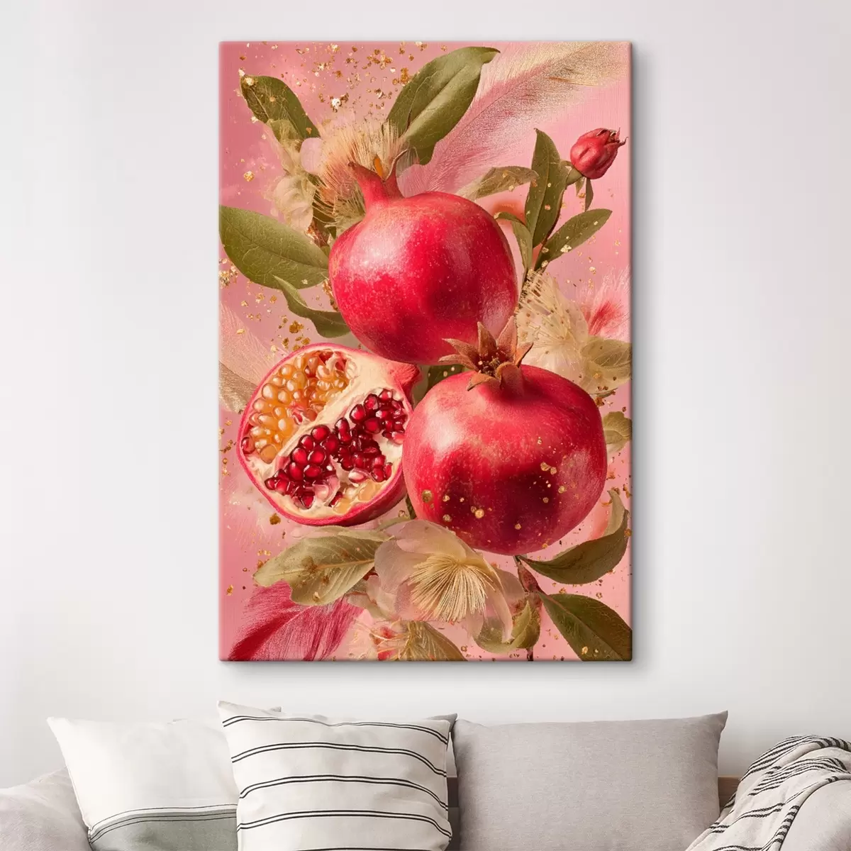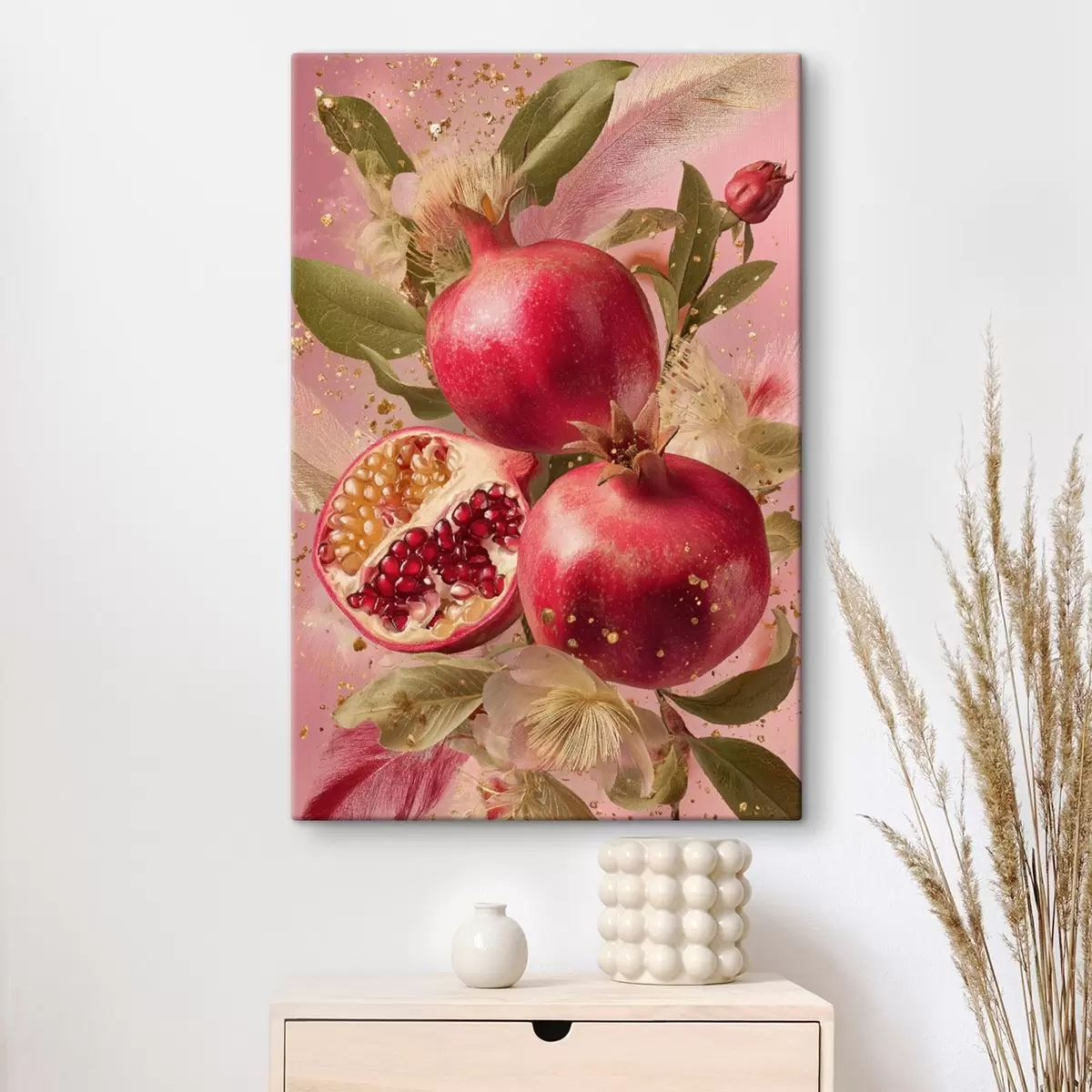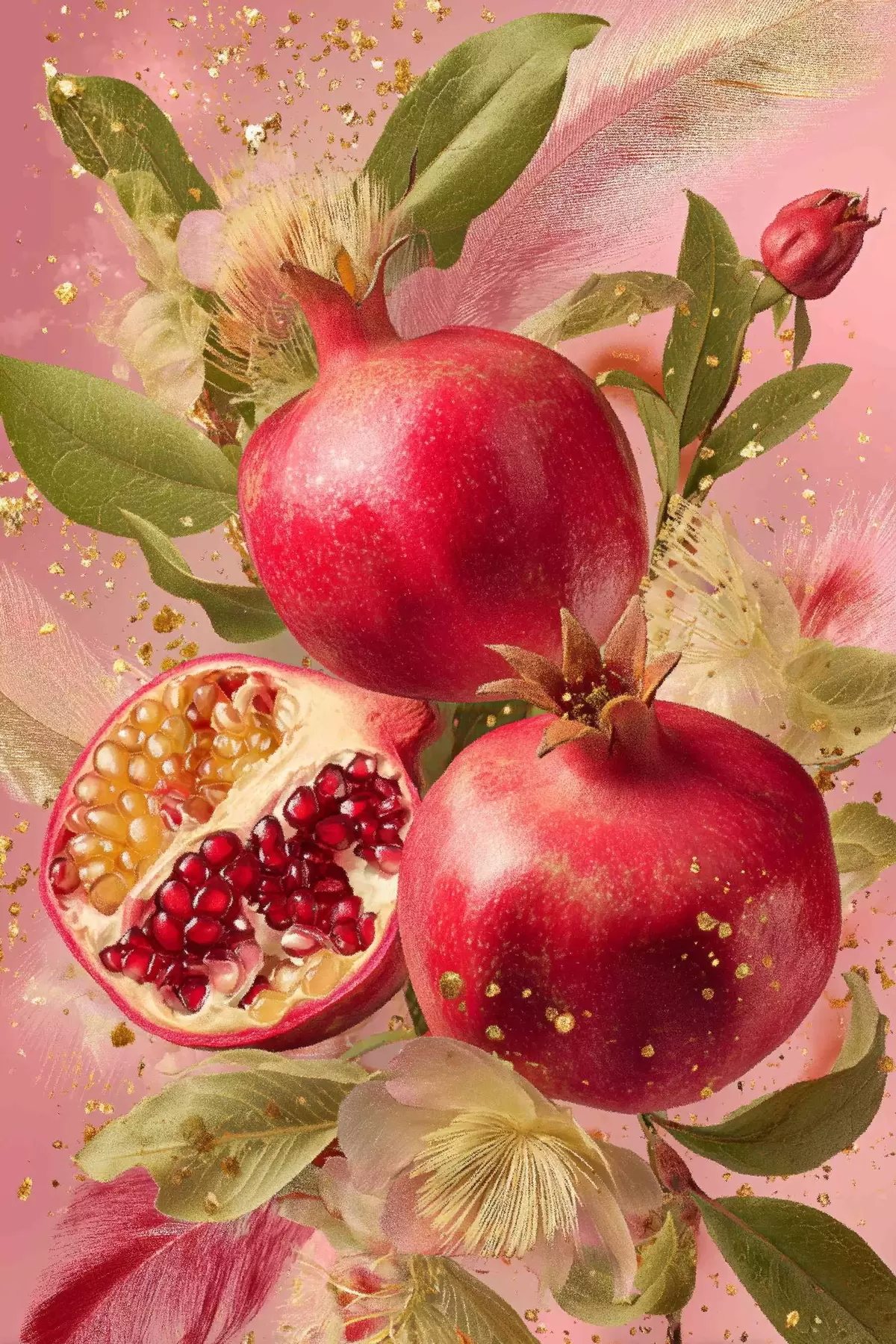 Tablouri Rodii coapte pe fond roz cu frunze și pete s45868