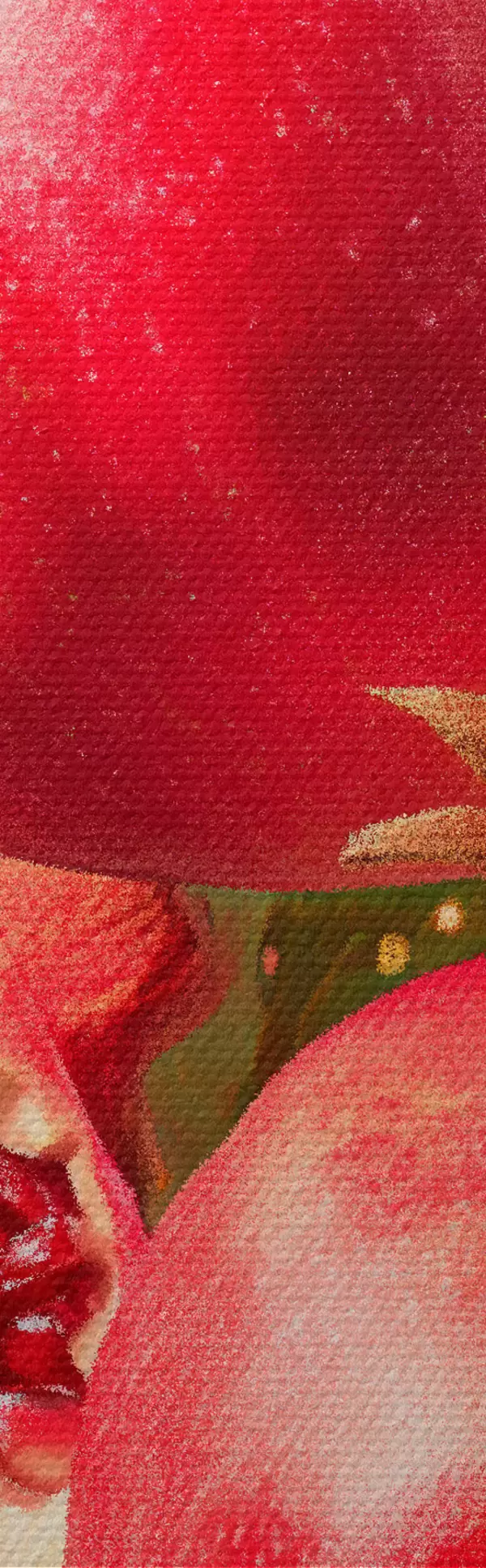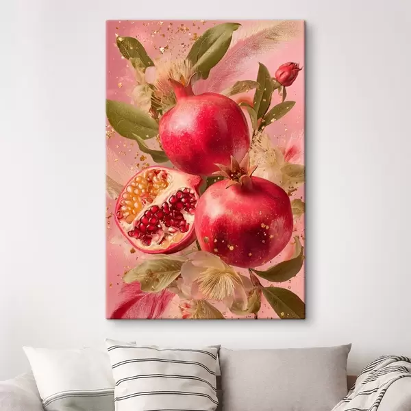 Pictură pe pânză Rodii coapte pe fond roz cu frunze și pete Nr s45868