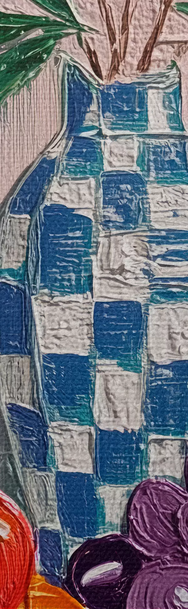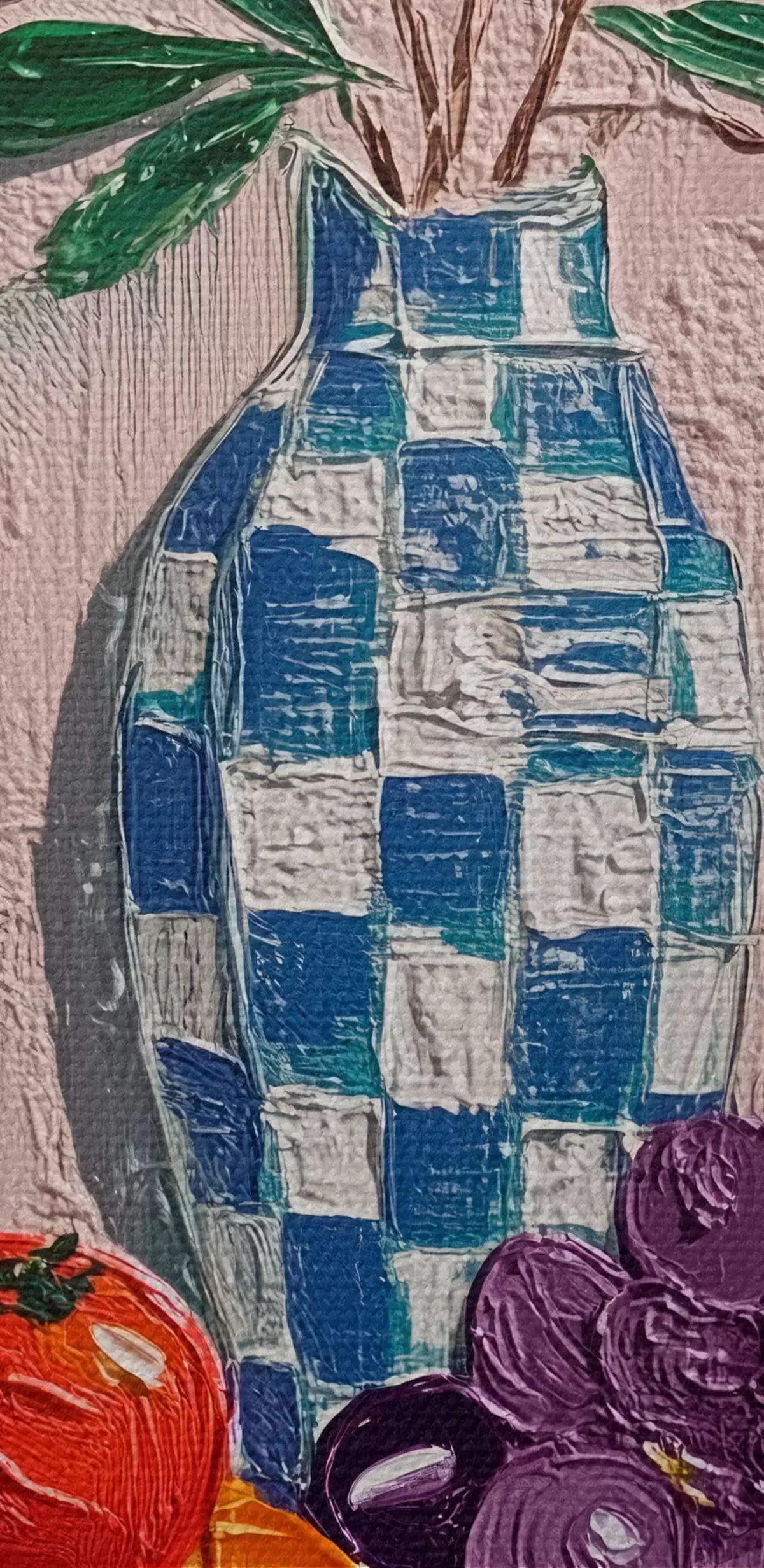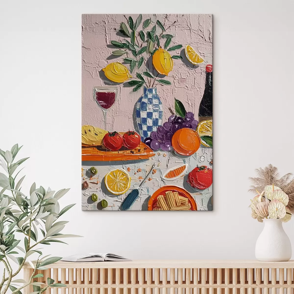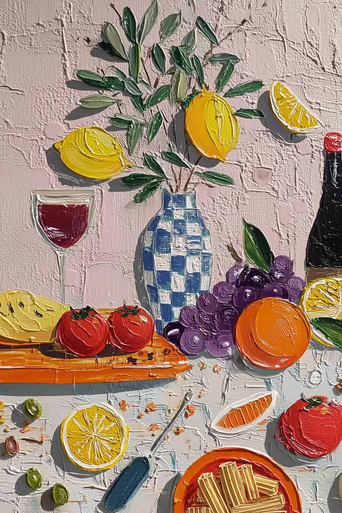Tablouri Natură moartă în culori pastelate: lămâi, struguri și roșii, impasto s45876