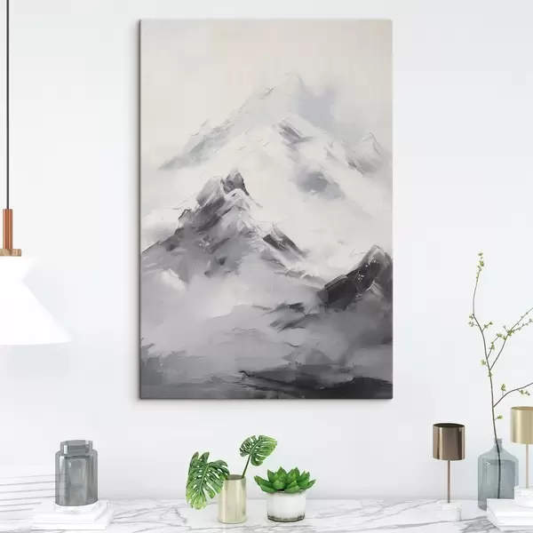 Tablouri Vârfuri de munte înzăpezite cu umbre cenușii, cer cenușiu, pensule, texturat, minimalist s45933