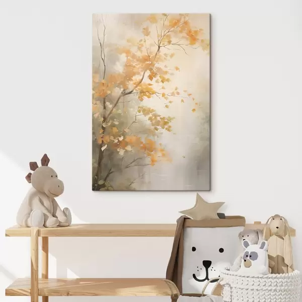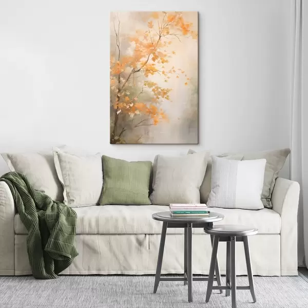 Pictură pe pânză Ramuri de copaci de toamnă cu frunze portocalii într-o pădure cu lumină difuză Nr s45940