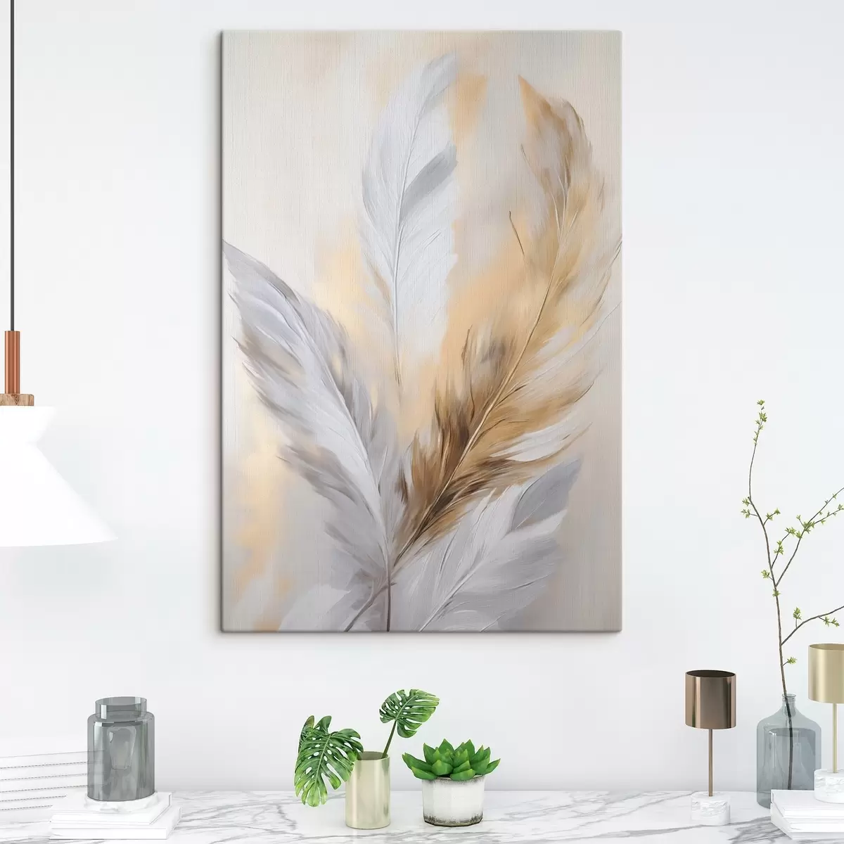 Pictură pe pânză Pene cu accente portocalii, compoziție minimalistă texturată, artă modernă Nr s45945