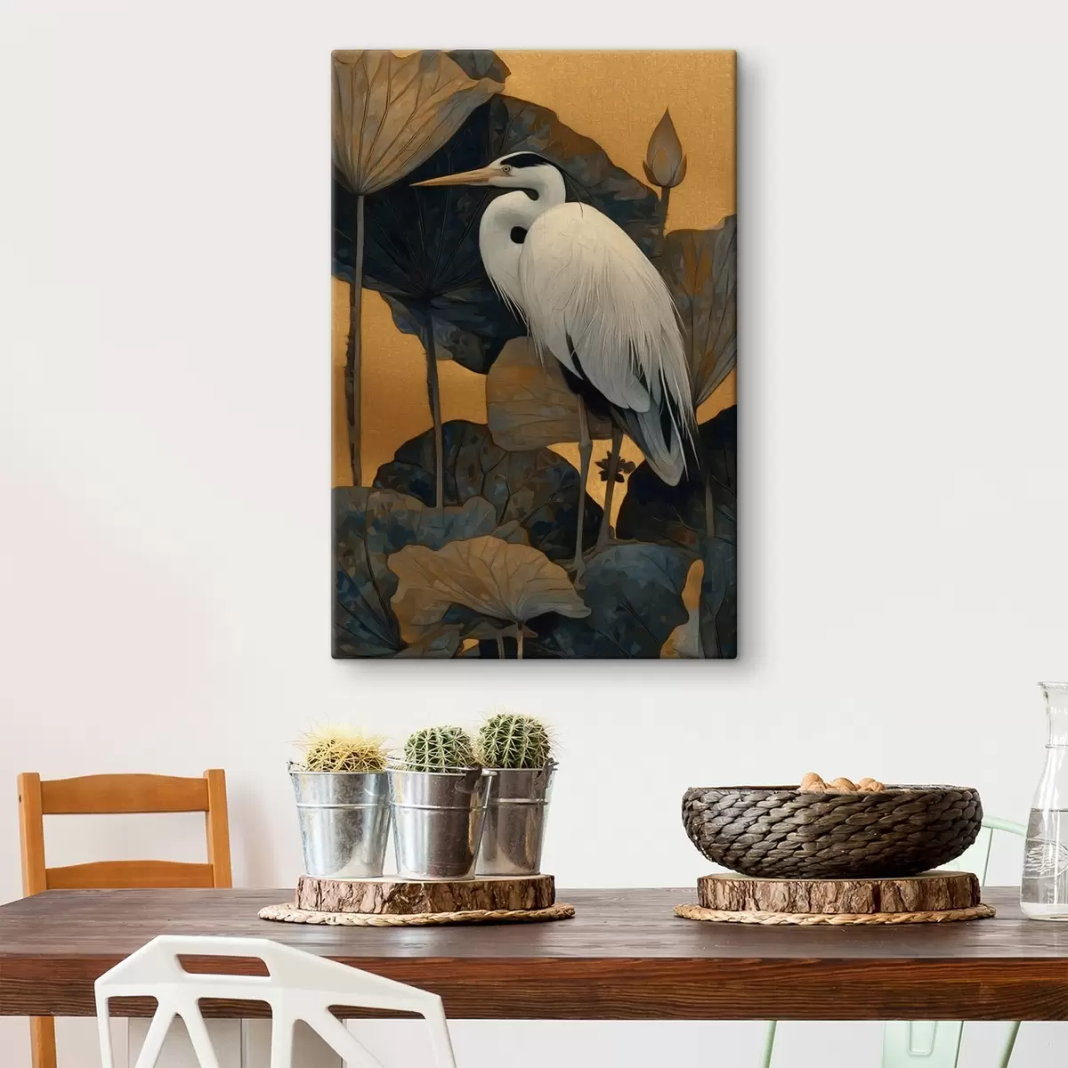 Pictură pe pânză Stârc alb printre frunze mari pe un fundal cald Nr s46147