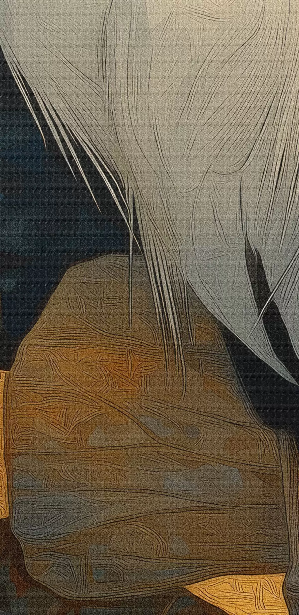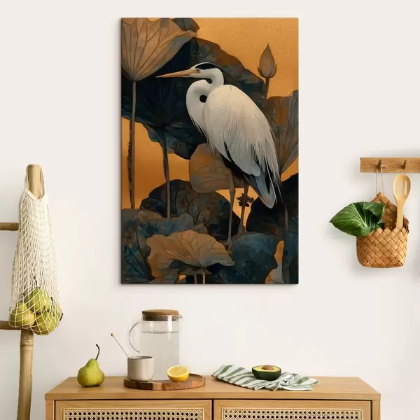Pictură pe pânză Stârc alb printre frunze mari pe un fundal cald Nr s46147