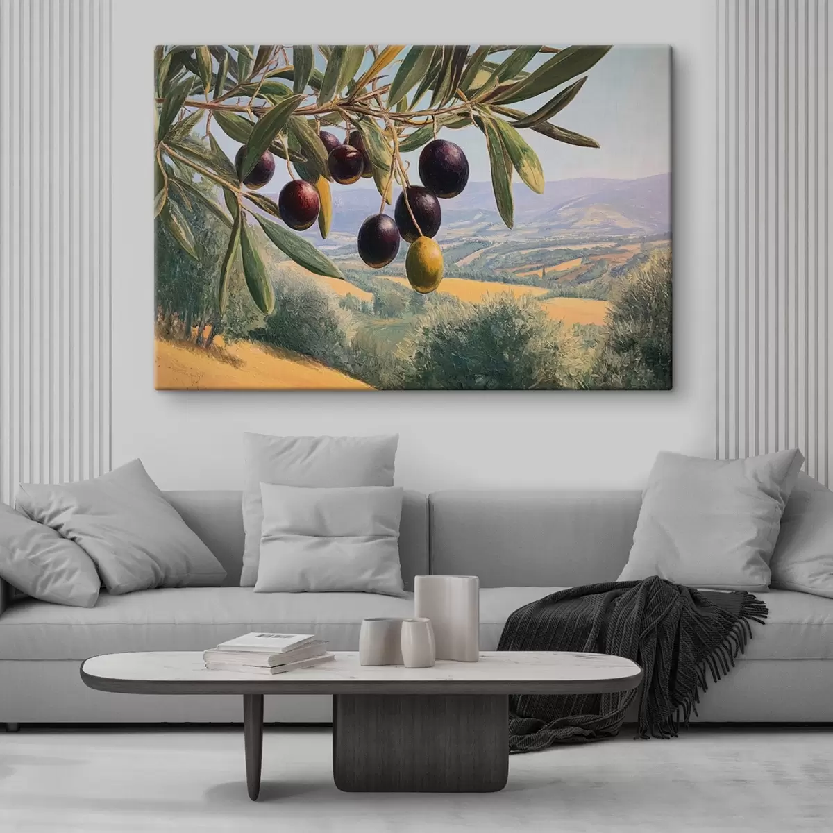 Tablouri Ramură de măslin cu fructe negre pe fundalul unui peisaj de vară s46150