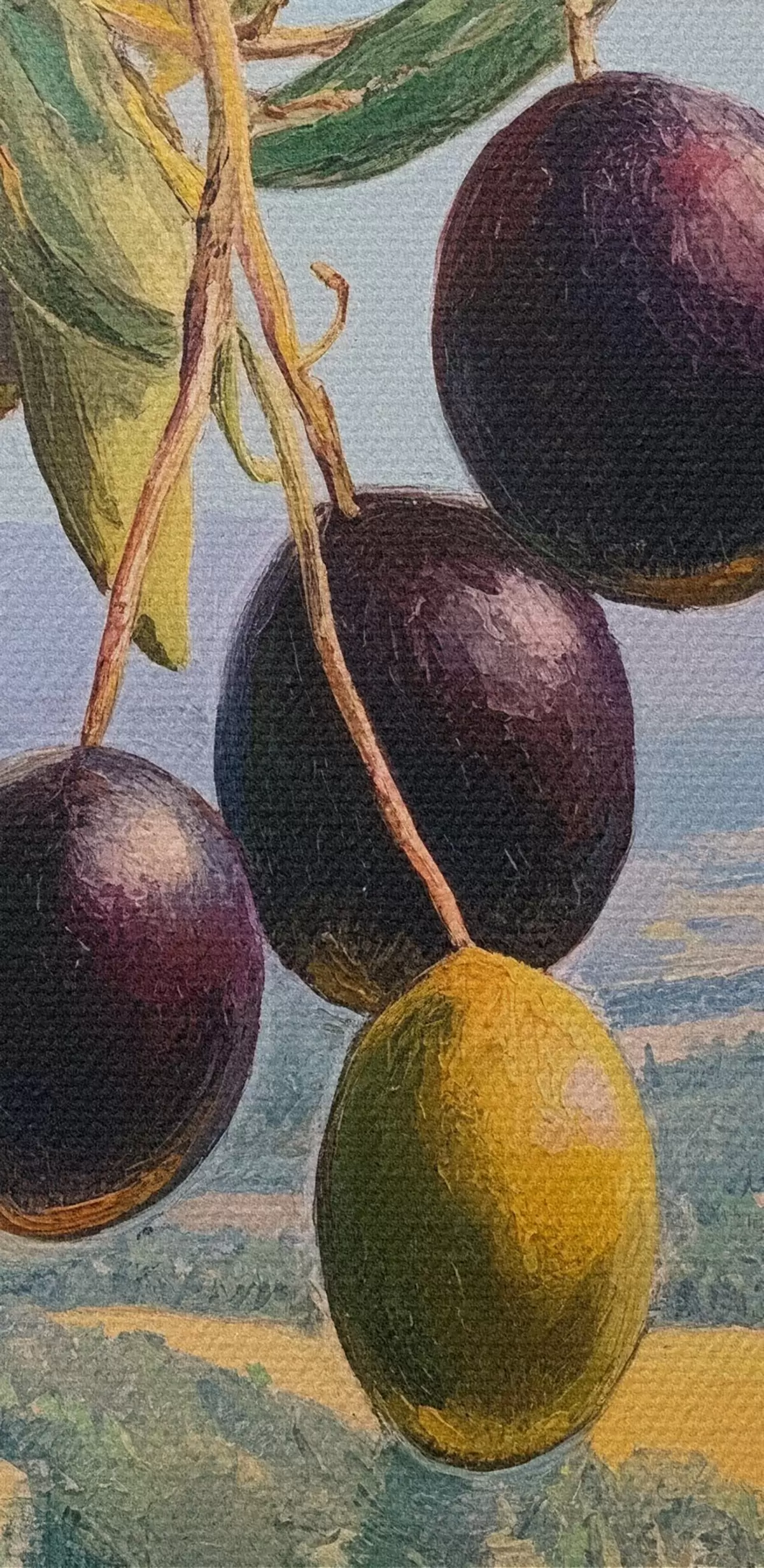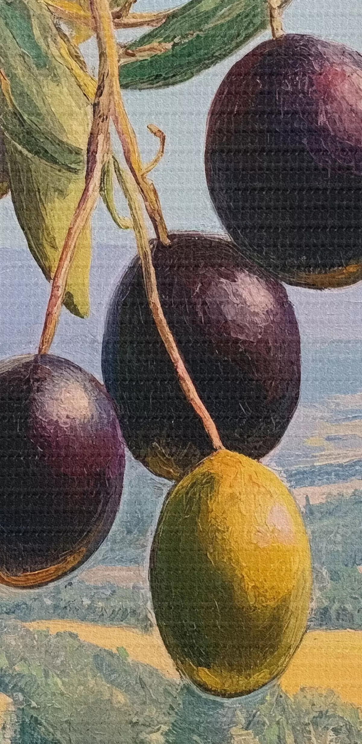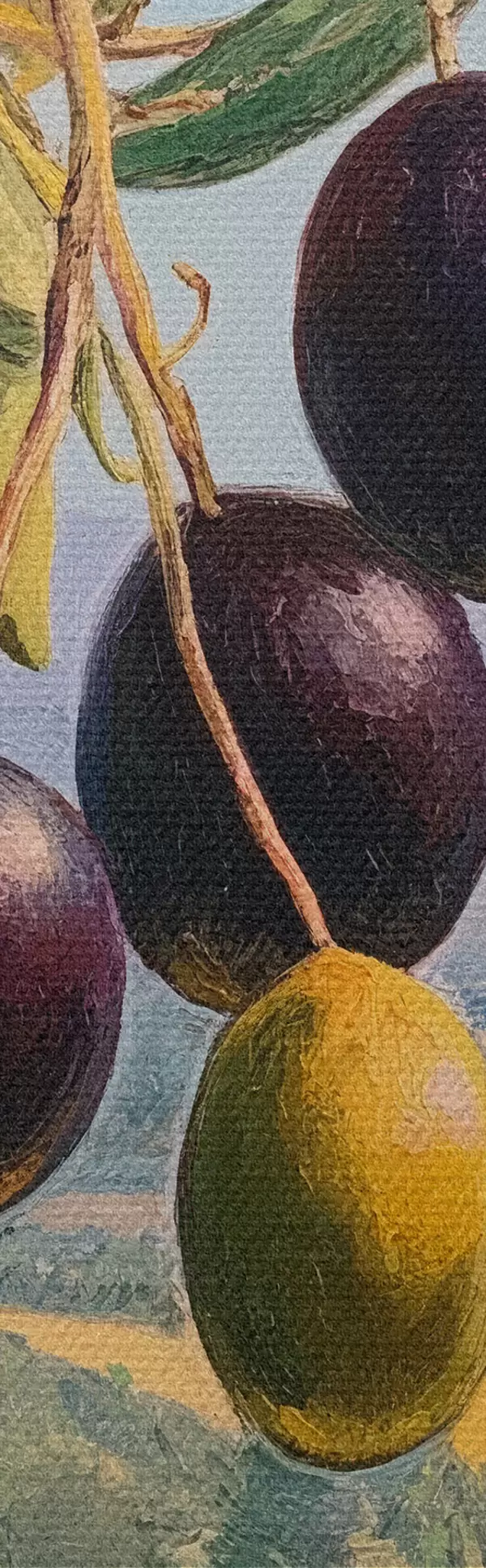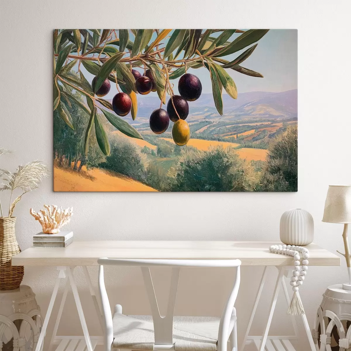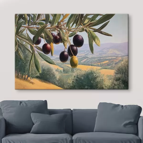 Pictură pe pânză Ramură de măslin cu fructe negre pe fundalul unui peisaj de vară Nr s46150