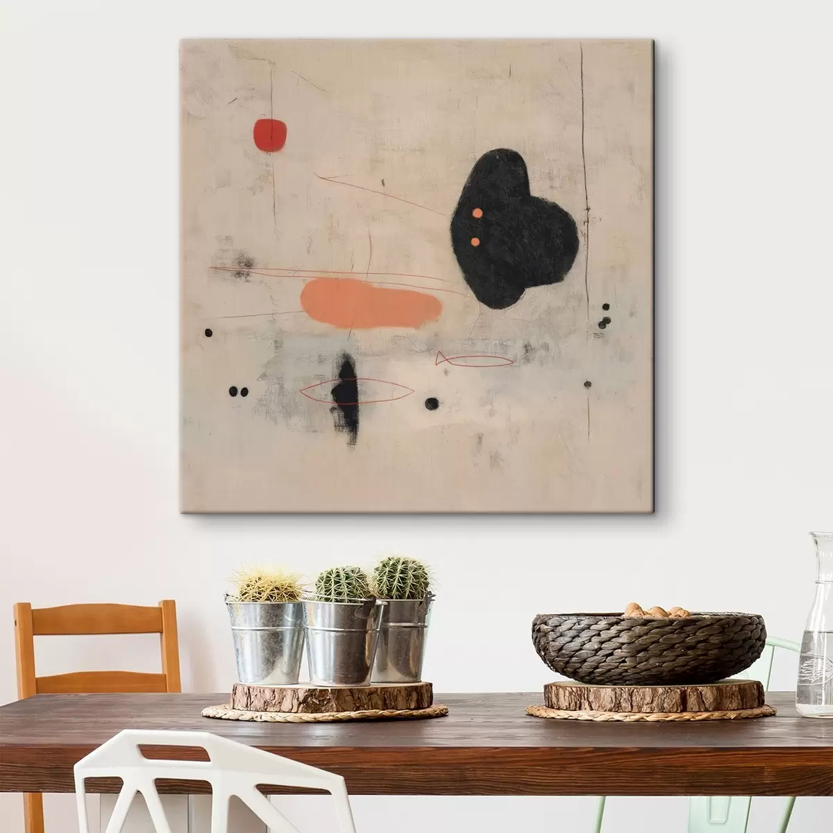 Pictură pe pânză Desen abstract minimalist cu accente negre și coral Nr s46159