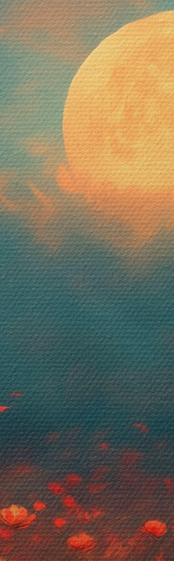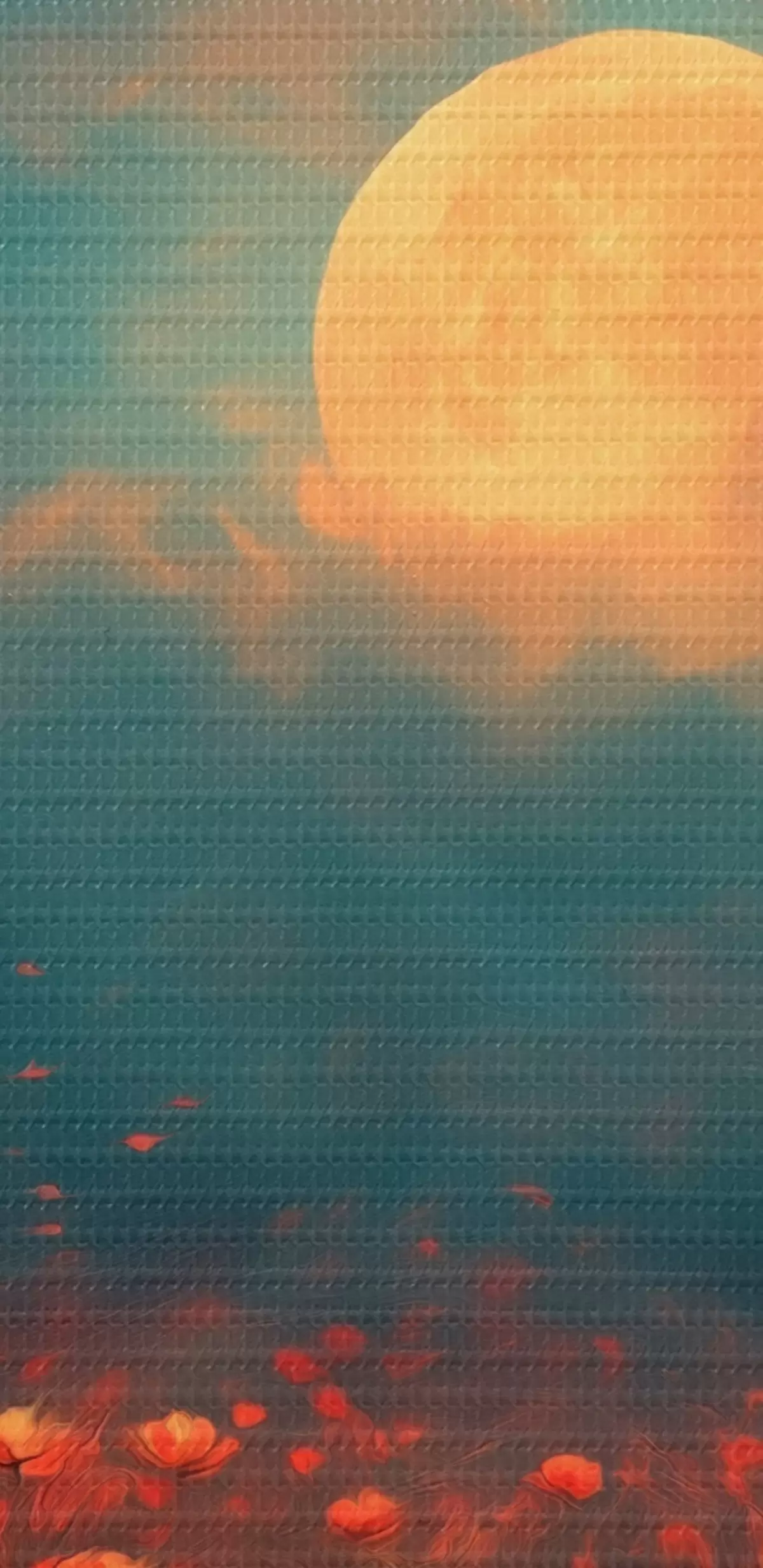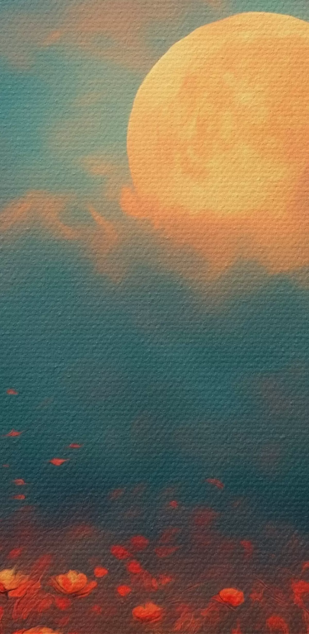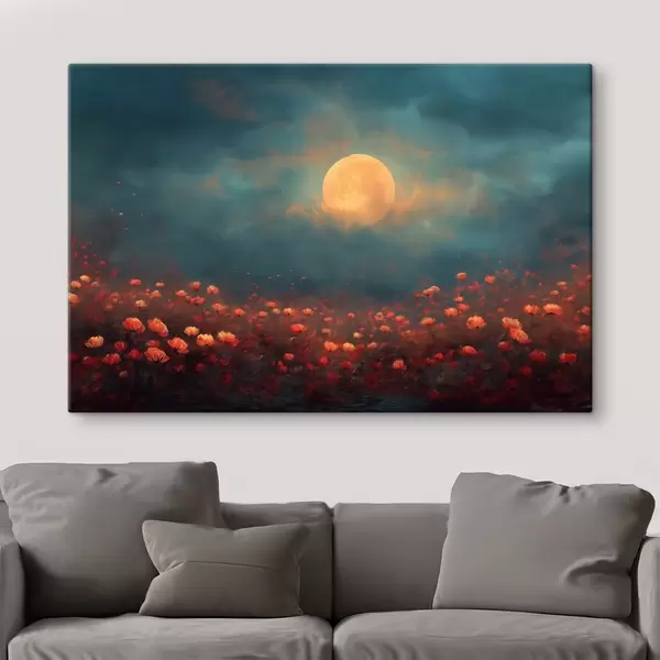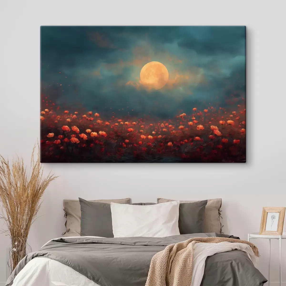 Pictură pe pânză Luna deasupra unui câmp de flori roșii într-un cer cețos de seară Nr s46167