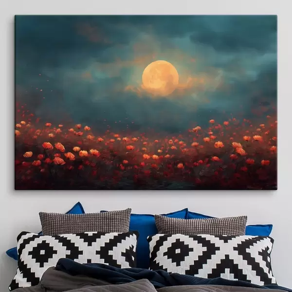 Pictură pe pânză Luna deasupra unui câmp de flori roșii într-un cer cețos de seară Nr s46167