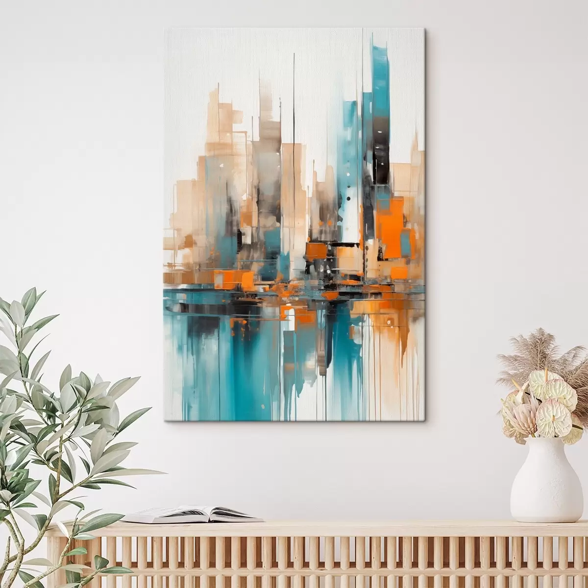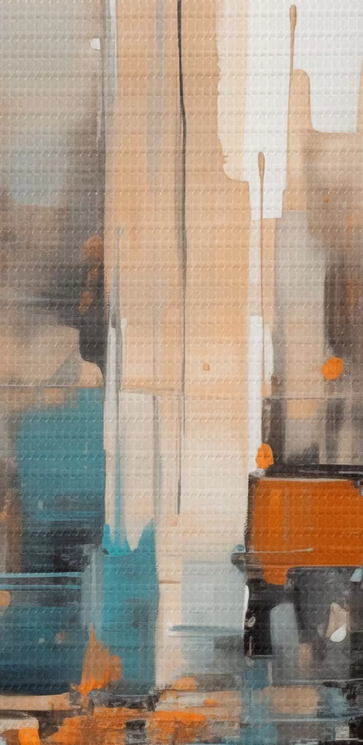 Pictură pe pânză Peisaj urban abstract cu portocaliu, verde-albastru și maro, pensule verticale și forme geometrice Nr s46266