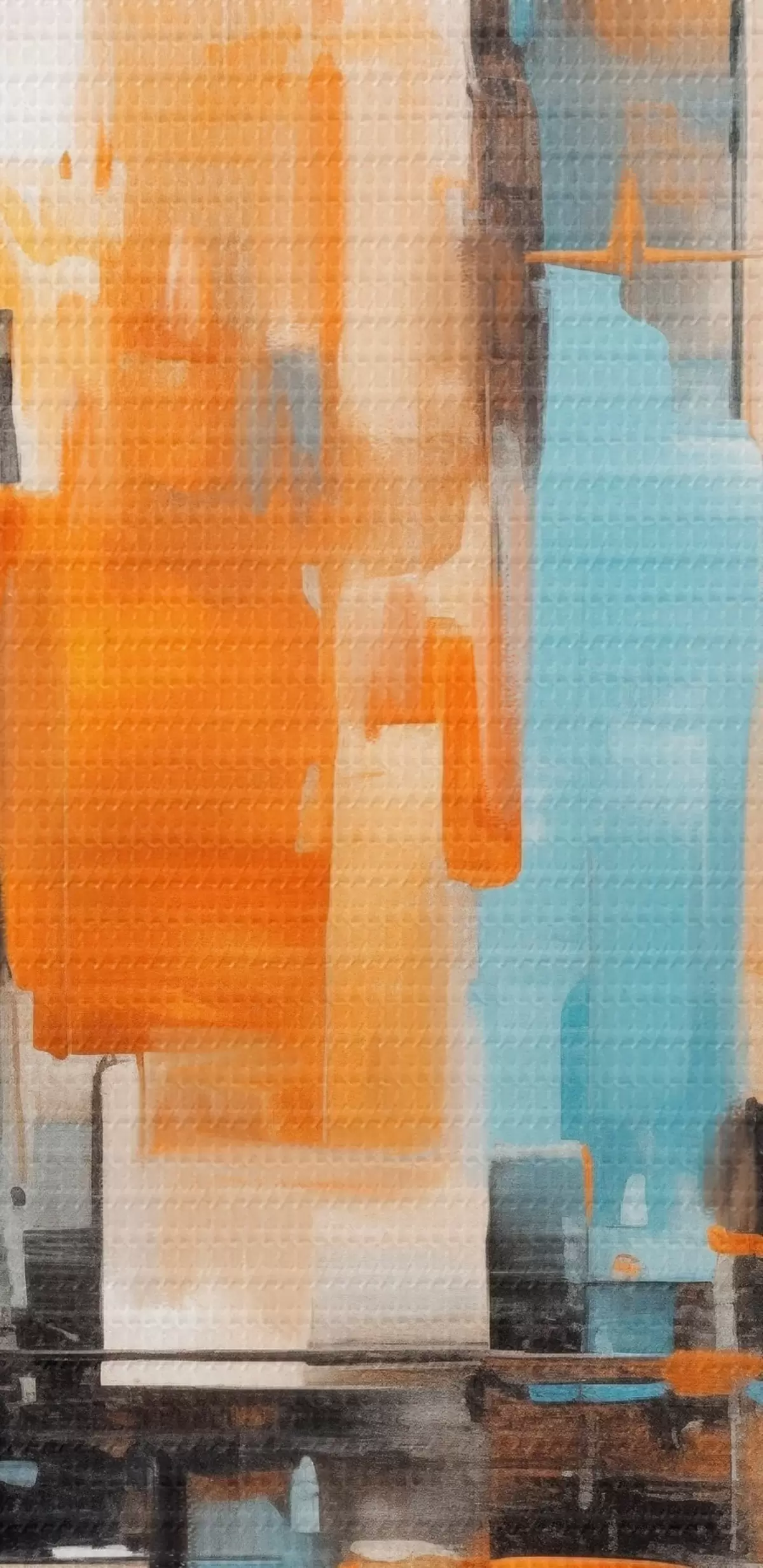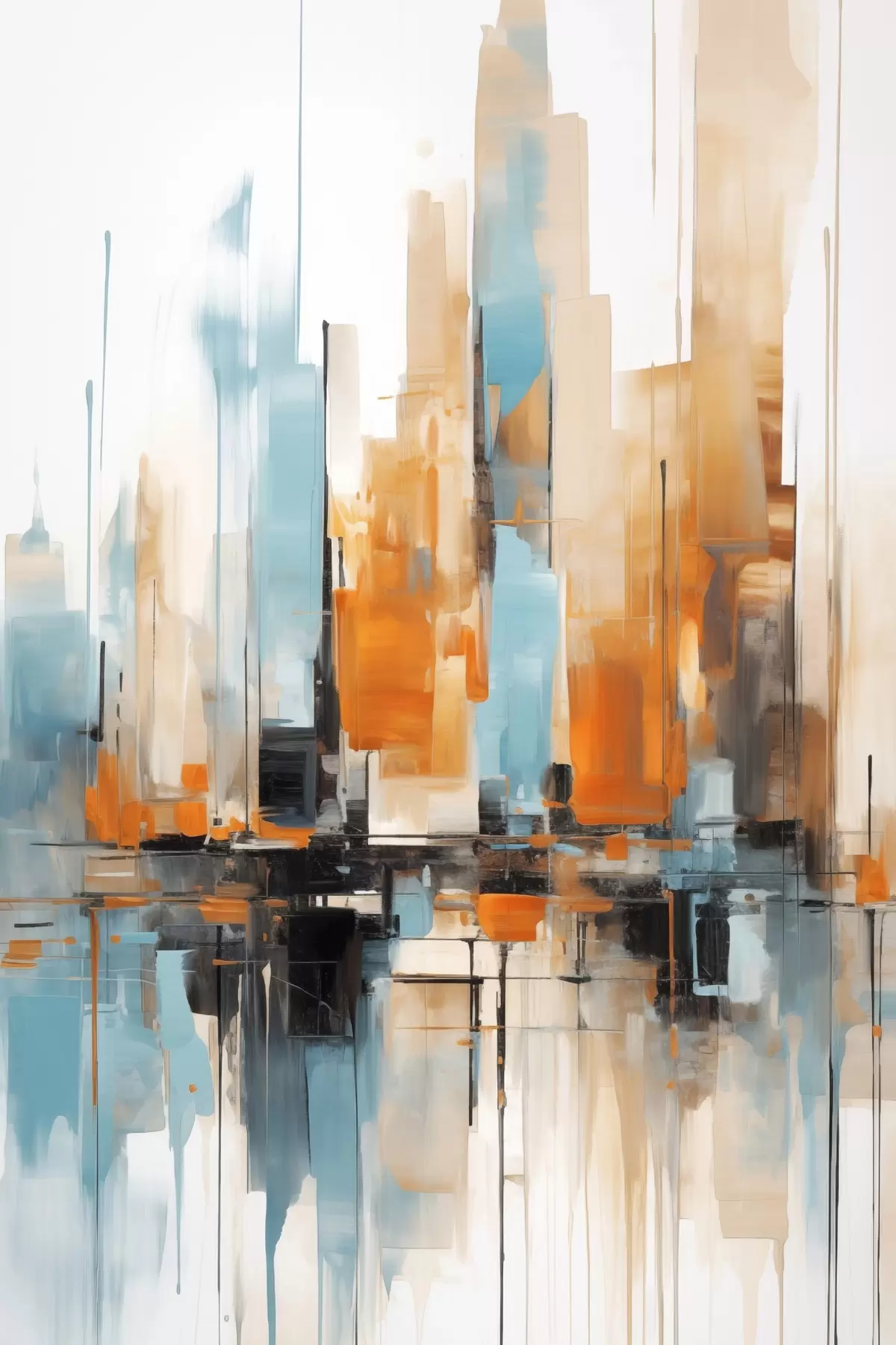 Tablouri Peisaj urban abstract cu tușe verticale în nuanțe de portocaliu, albastru și alb, stil pictural s46267
