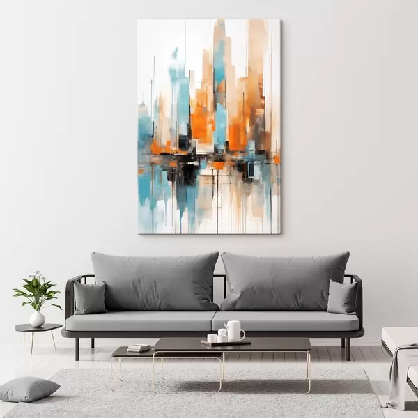 Pictură pe pânză Peisaj urban abstract cu tușe verticale în nuanțe de portocaliu, albastru și alb, stil pictural Nr s46267