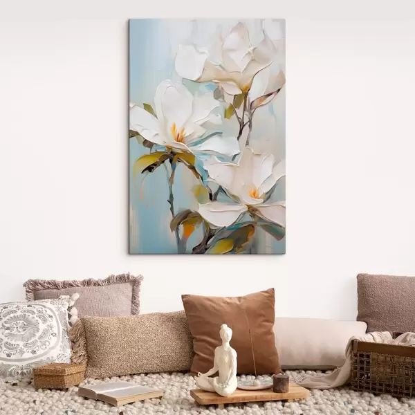 Tablouri Flori albe de magnolie, fundal albastru deschis cu tușe delicate, stil pictură în ulei, textură impasto s46276