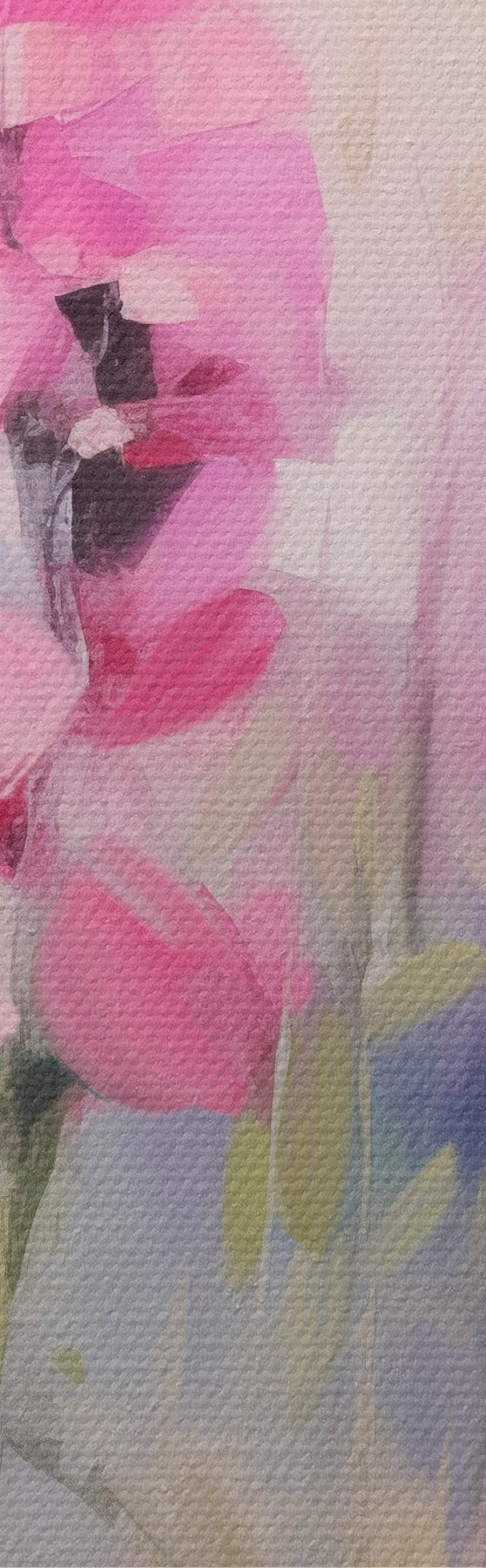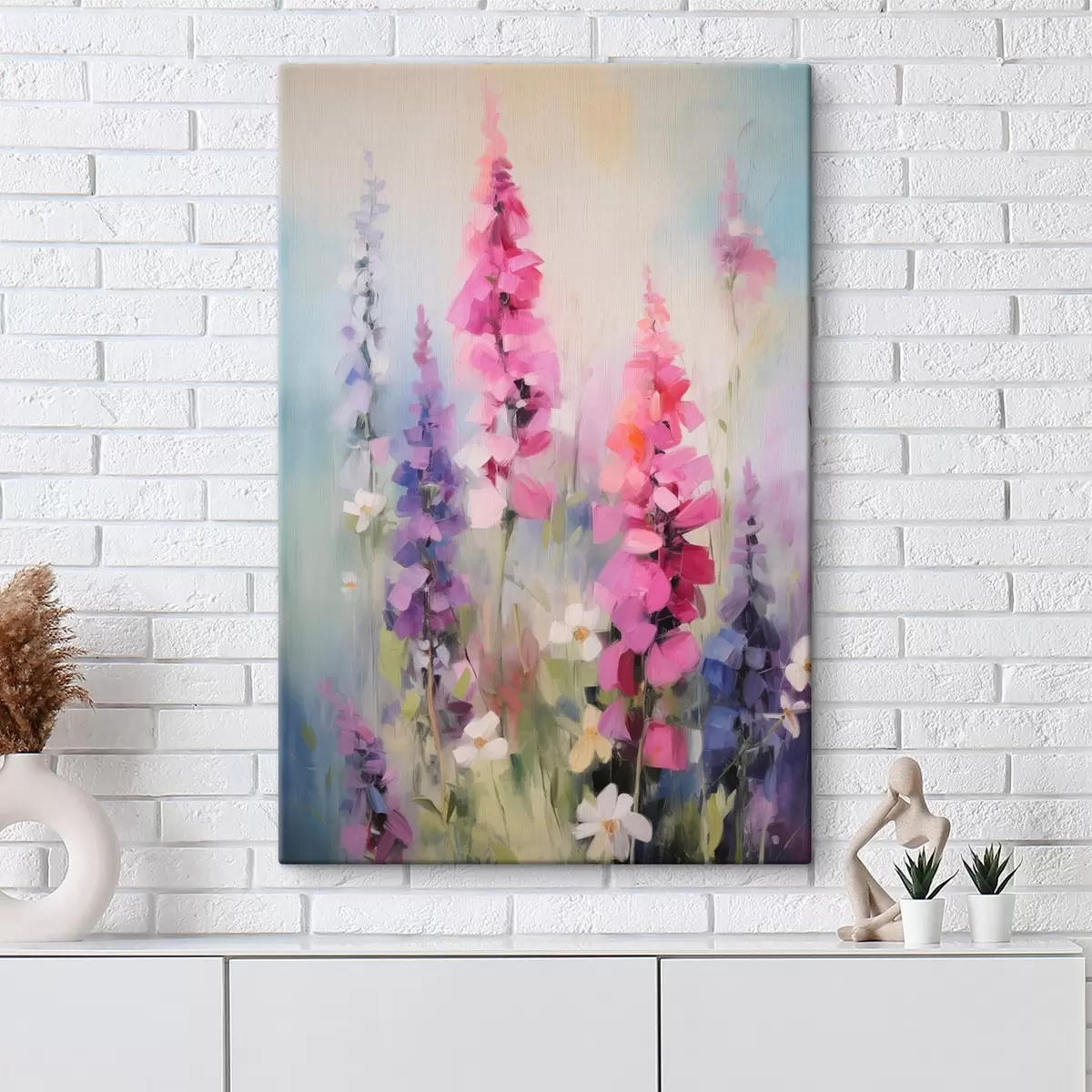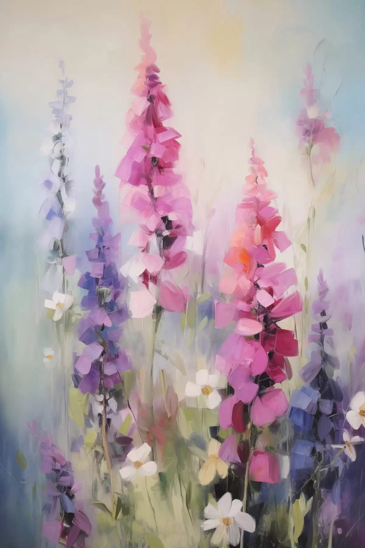 Pictură pe pânză Flori roz și violet cu margarete albe într-un câmp, tușe delicate, culori pastelate, stil impresionist Nr s46279