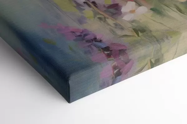 Pictură pe pânză Flori roz și violet cu margarete albe într-un câmp, tușe delicate, culori pastelate, stil impresionist Nr s46279