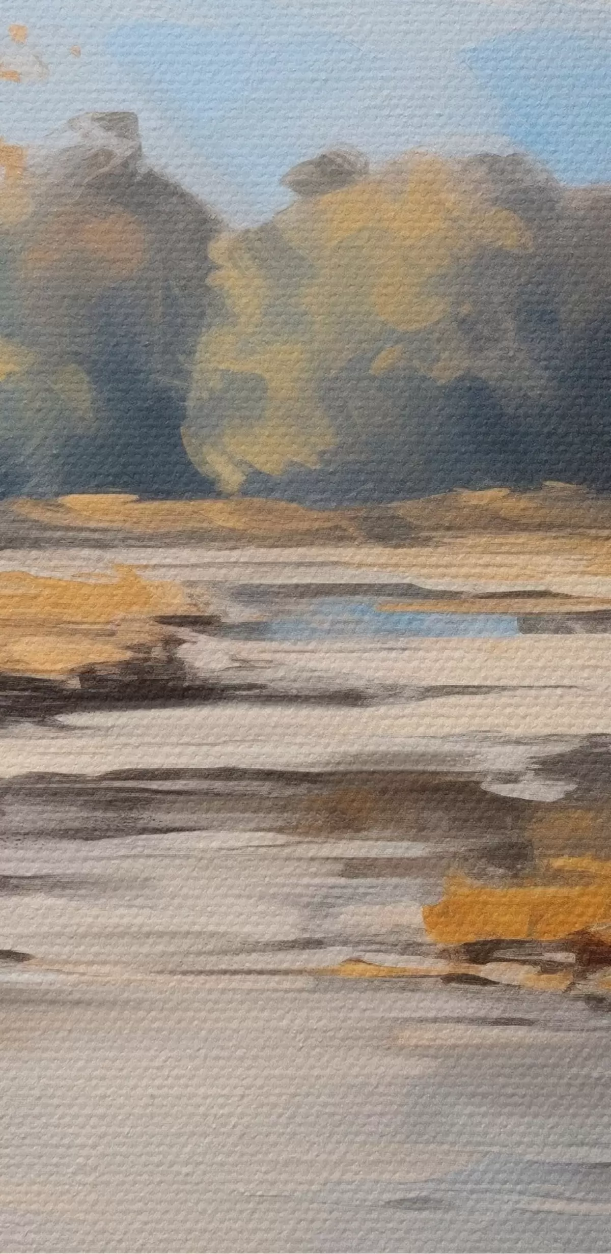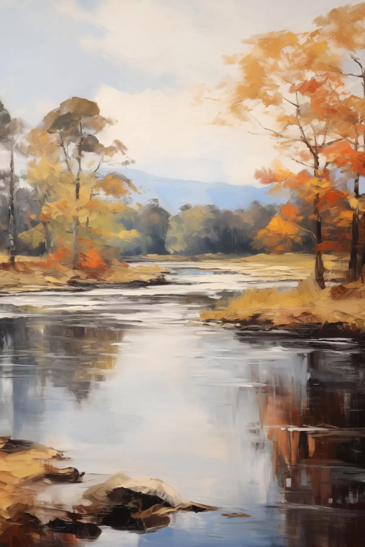 Tablouri Peisaj cu un râu care curge printr-o pădure în toamnă, copaci galbeni și portocalii, stil pictural s46281