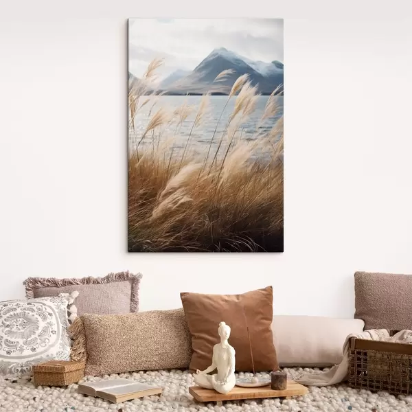 Tablouri Iarbă de pampas cu un lac și munți în fundal, iluminare difuză, culori discrete, stil naturalist s46283