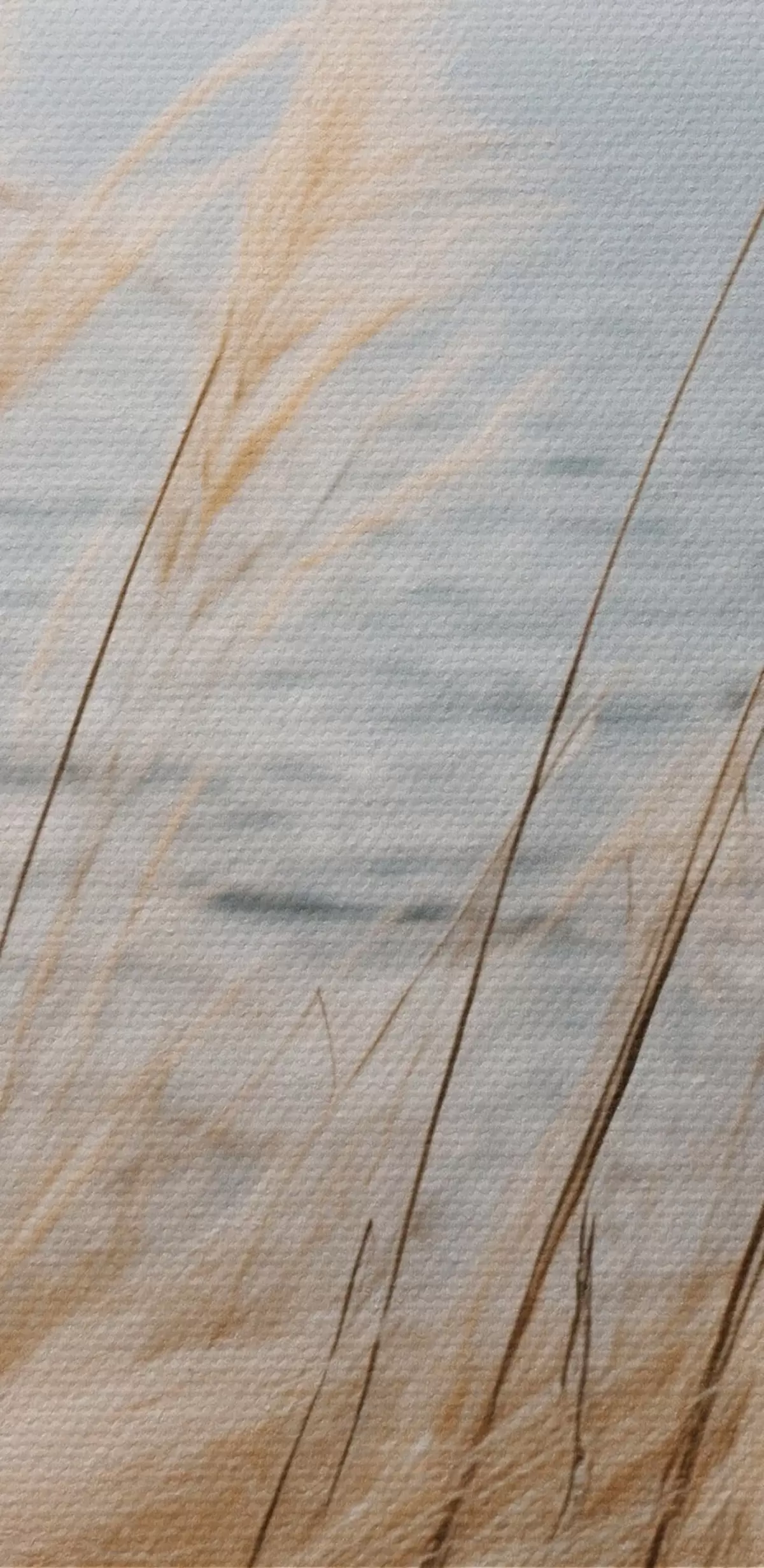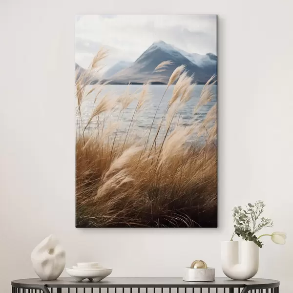 Tablouri Iarbă de pampas cu un lac și munți în fundal, iluminare difuză, culori discrete, stil naturalist s46283