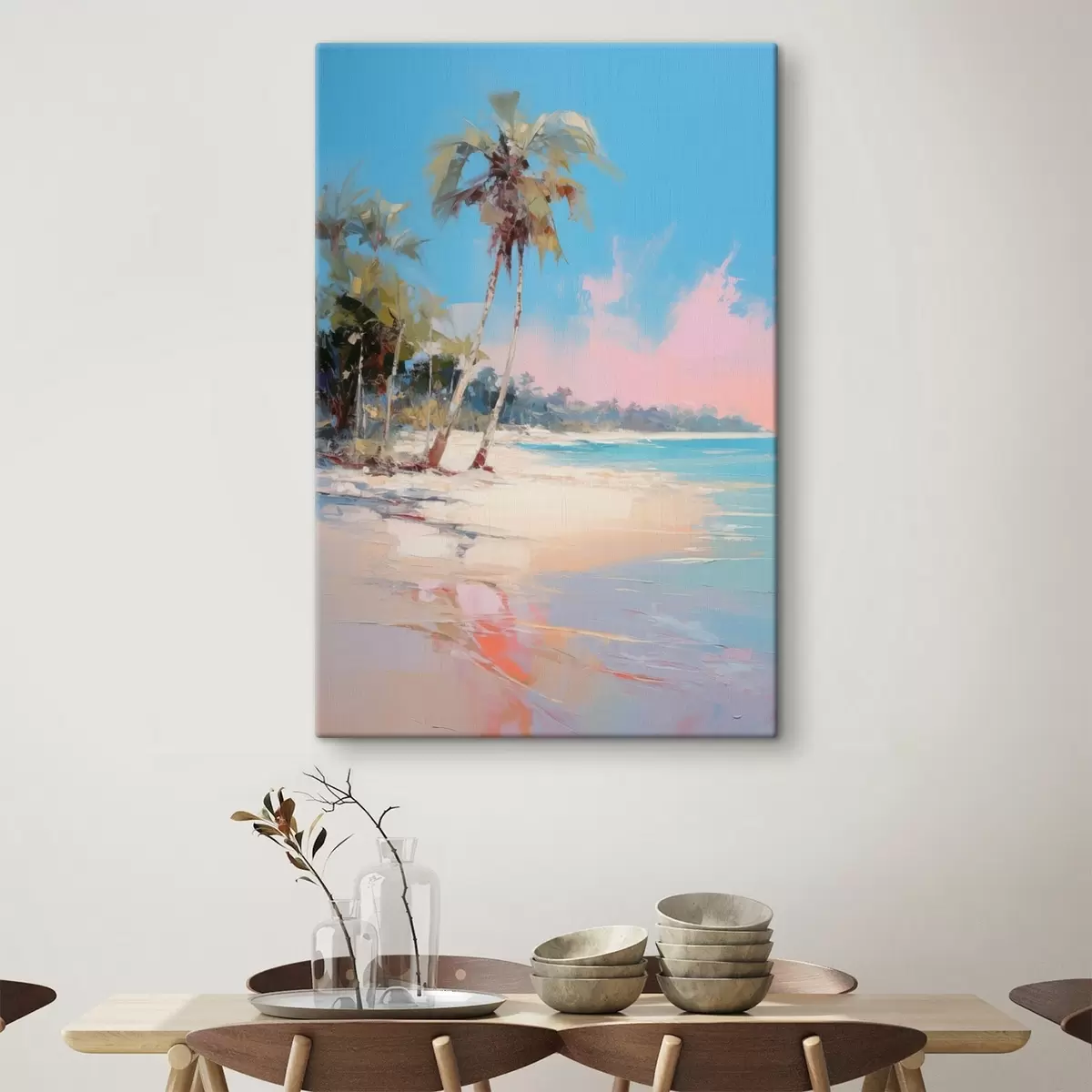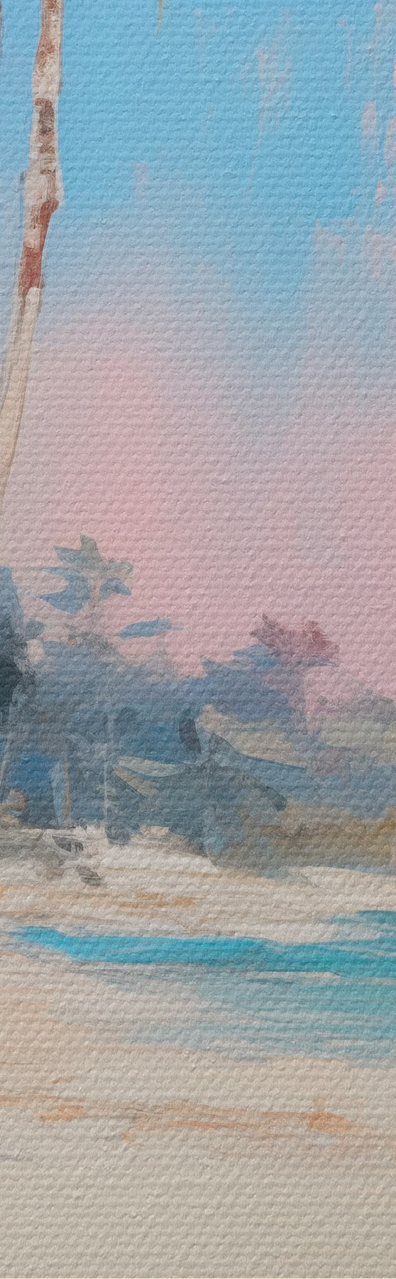 Pictură pe pânză Plajă tropicală abstractă cu nisip alb și palmieri, cer albastru cu nori albi Nr s46285