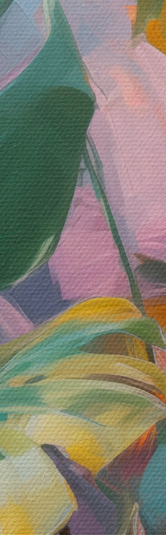 Pictură pe pânză Plantă abstractă monstera cu frunze verzi vibrante, pe un fundal de nuanțe delicate de roz și violet Nr s46286