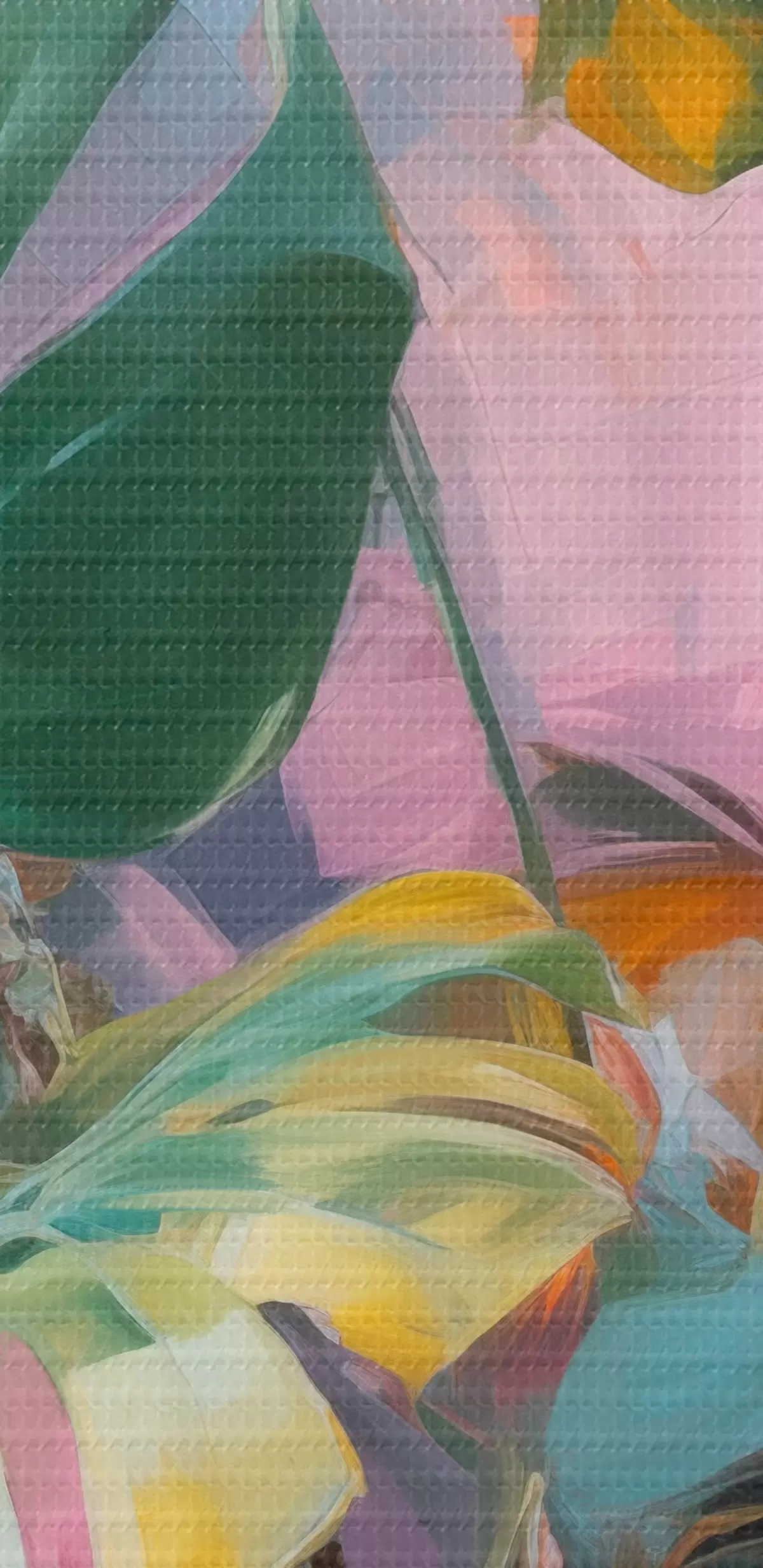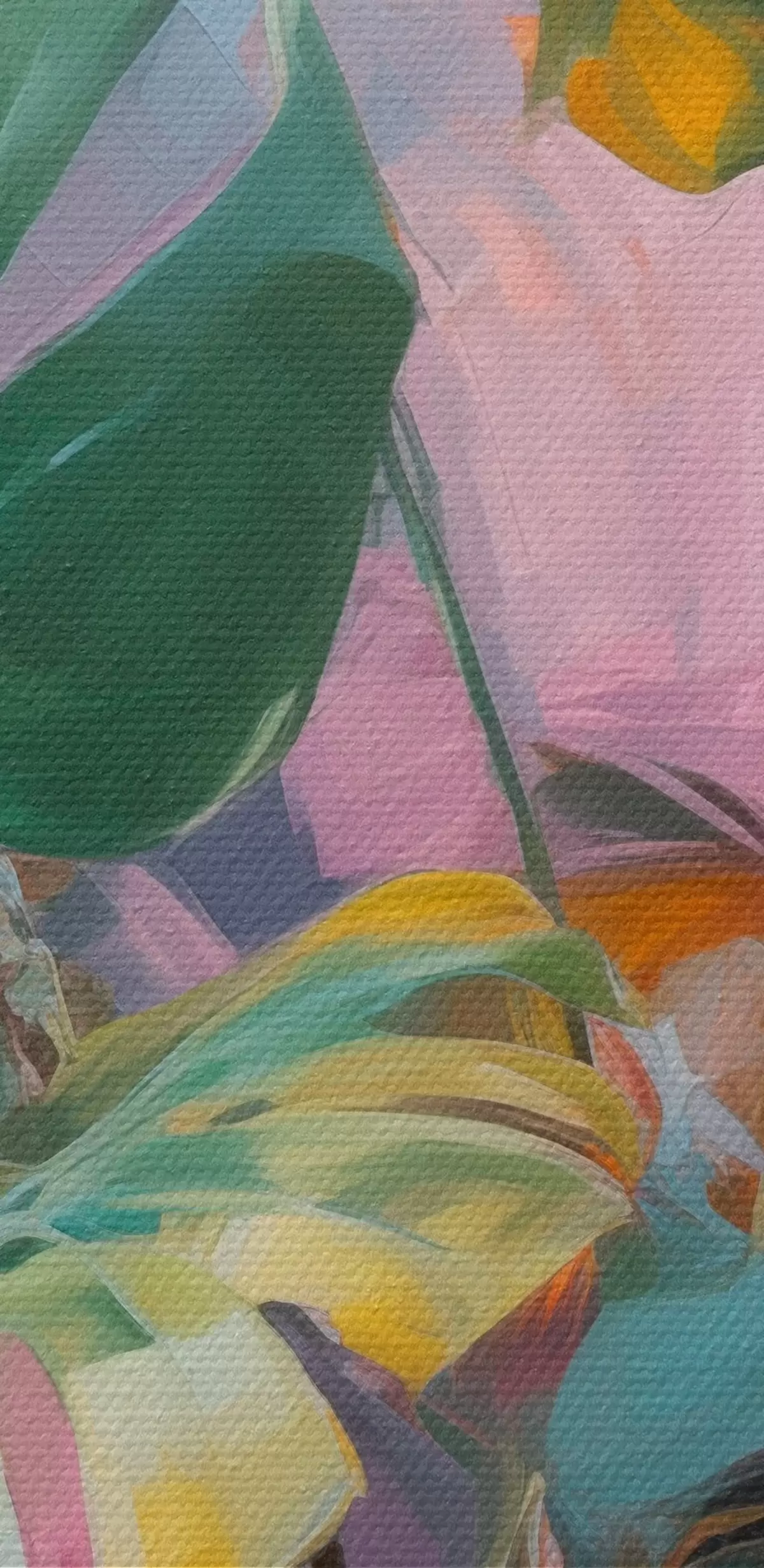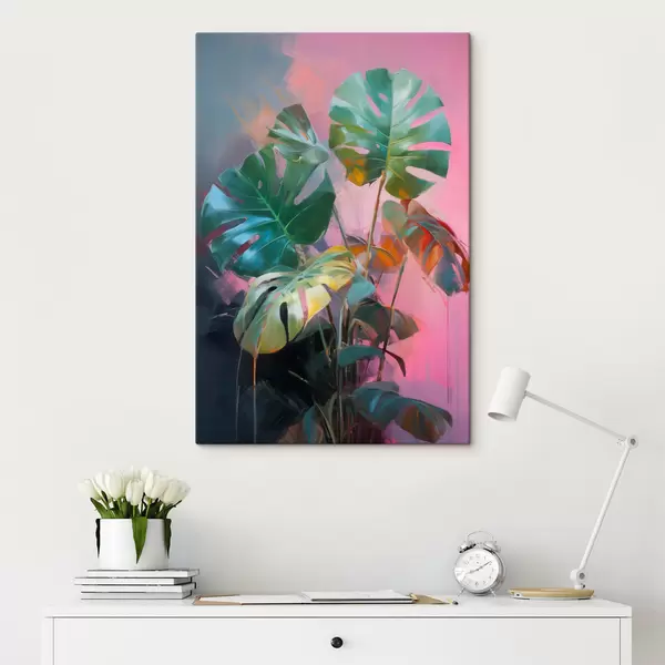 Pictură pe pânză Plantă abstractă monstera cu frunze verzi vibrante, pe un fundal de nuanțe delicate de roz și violet Nr s46286