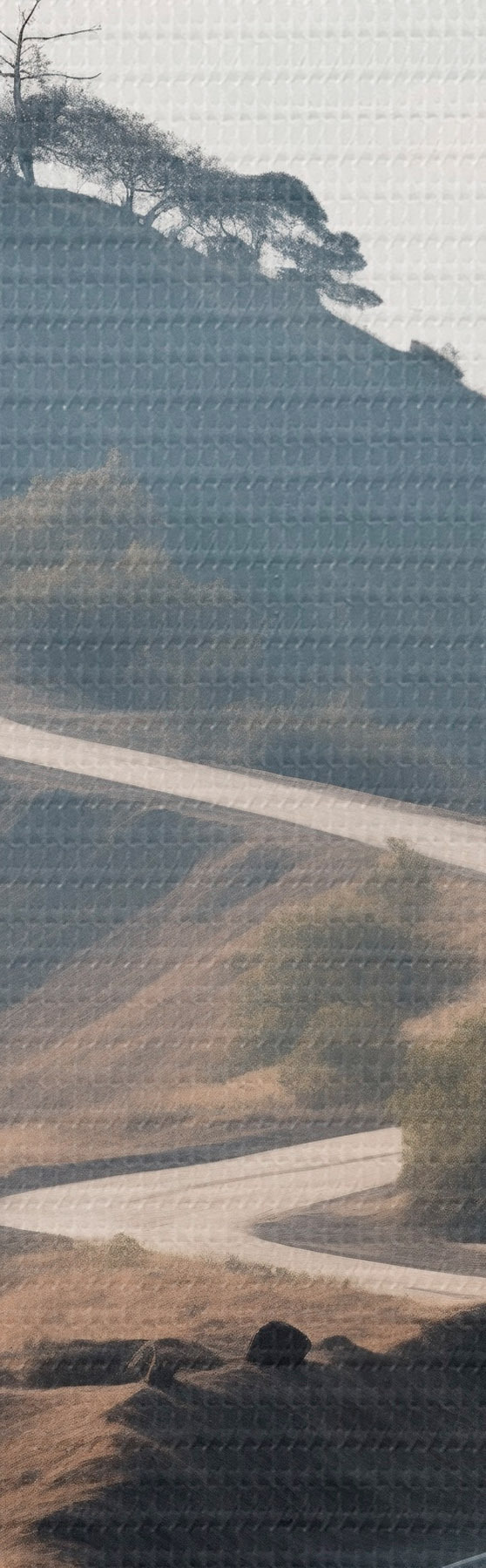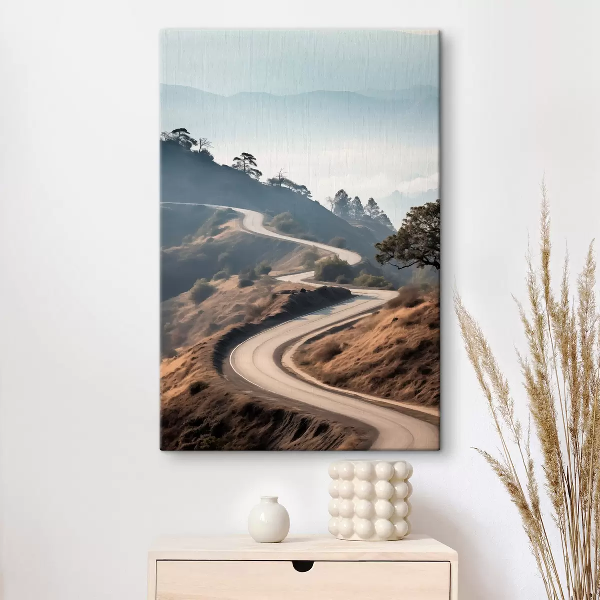 Pictură pe pânză Un drum sinuos prin peisajul deluros, cu iarbă uscată, sub un cer senin, cu munți în depărtare Nr s46289