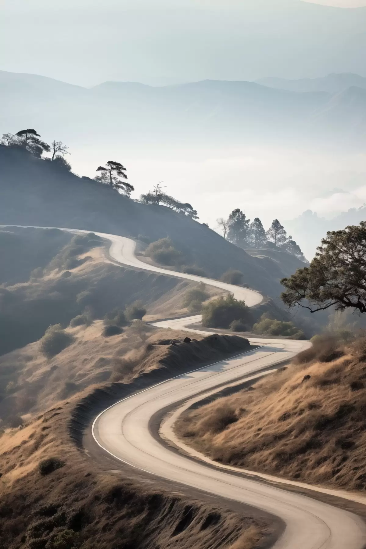 Tablouri Un drum sinuos prin peisajul deluros, cu iarbă uscată, sub un cer senin, cu munți în depărtare s46289