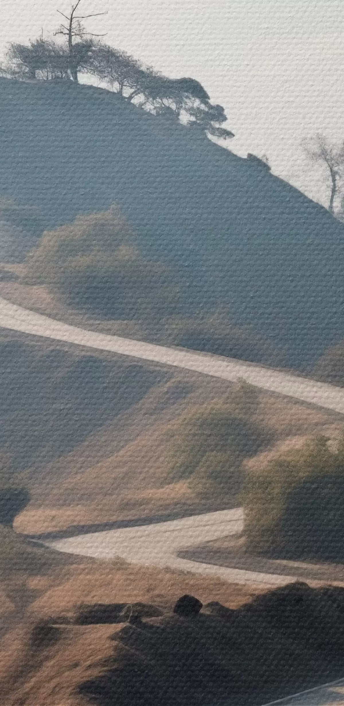 Pictură pe pânză Un drum sinuos prin peisajul deluros, cu iarbă uscată, sub un cer senin, cu munți în depărtare Nr s46289