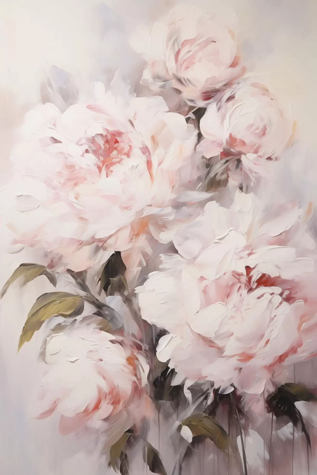 Pictură pe pânză Un buchet de bujori roz deschis cu frunze verzi, tușe delicate, culori pastelate, pe un fundal deschis Nr s46294