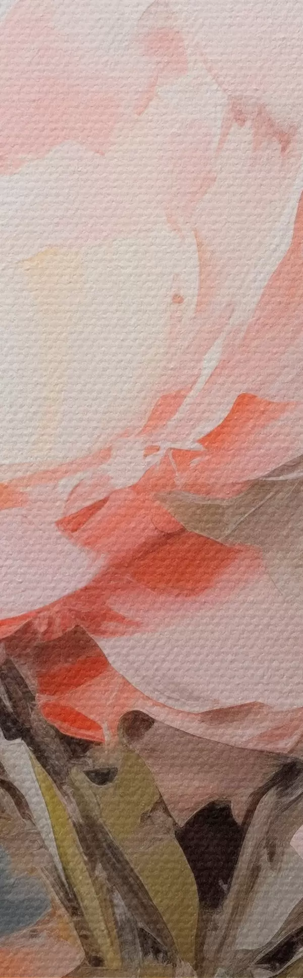 Pictură pe pânză Un buchet de bujori roz și albi într-o vază de sticlă, tușe delicate, culori pastelate, fundal neutru Nr s46295