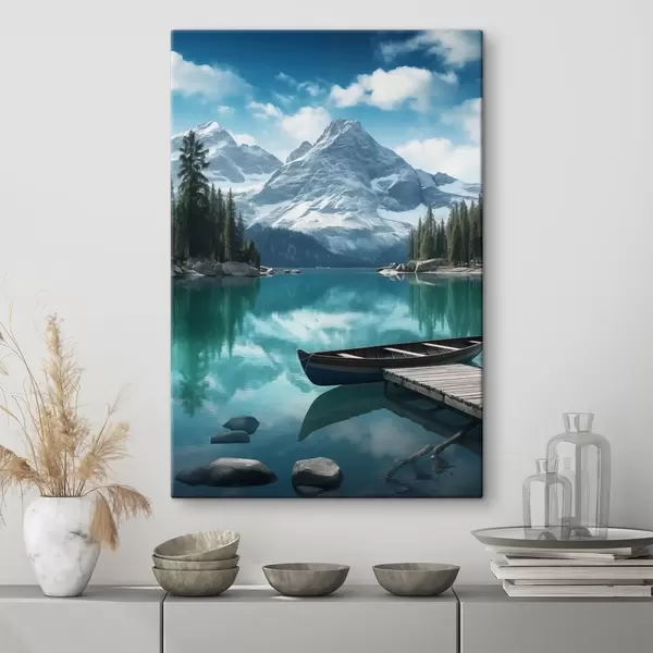 Pictură pe pânză Lac alpin cu canoe și vârfuri înzăpezite Nr s46481