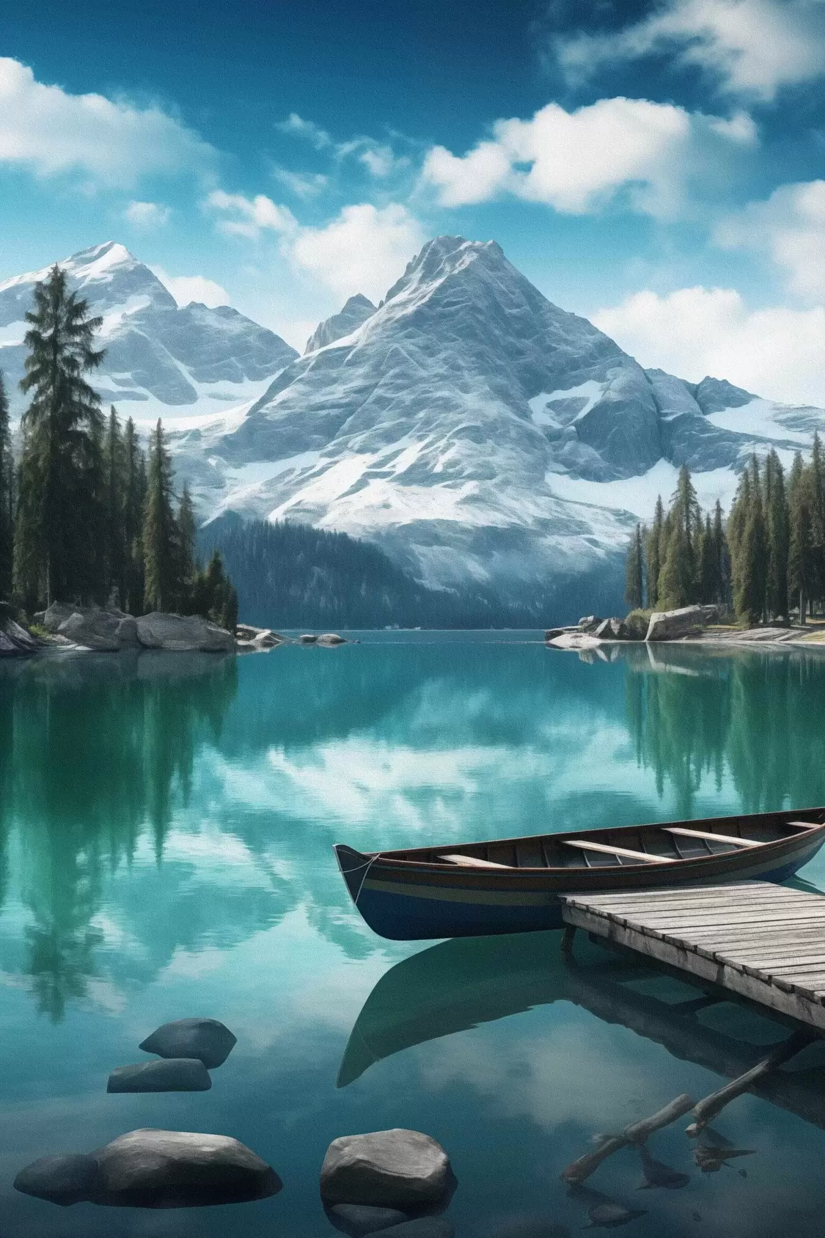 Tablouri Lac alpin cu canoe și vârfuri înzăpezite s46481