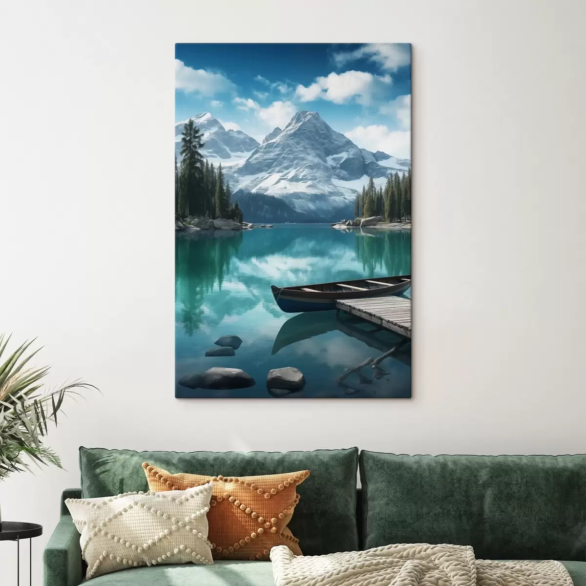 Pictură pe pânză Lac alpin cu canoe și vârfuri înzăpezite Nr s46481