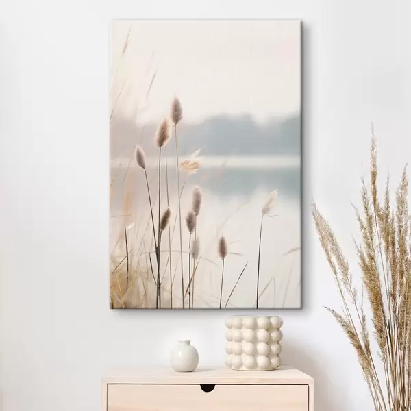 Pictură pe pânză Stuf moale pe malul unui lac încețoșat, tonuri pastelate de bej Nr s46504