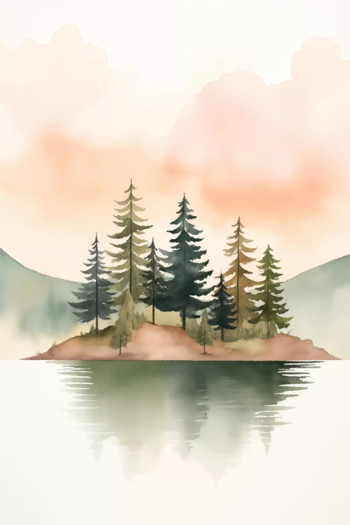 Tablouri Pini acuarelați pe o insuliță încețoșată, cerul de culoarea piersicii s46505