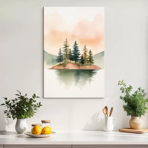Pictură pe pânză Pini acuarelați pe o insuliță încețoșată, cerul de culoarea piersicii Nr s46505