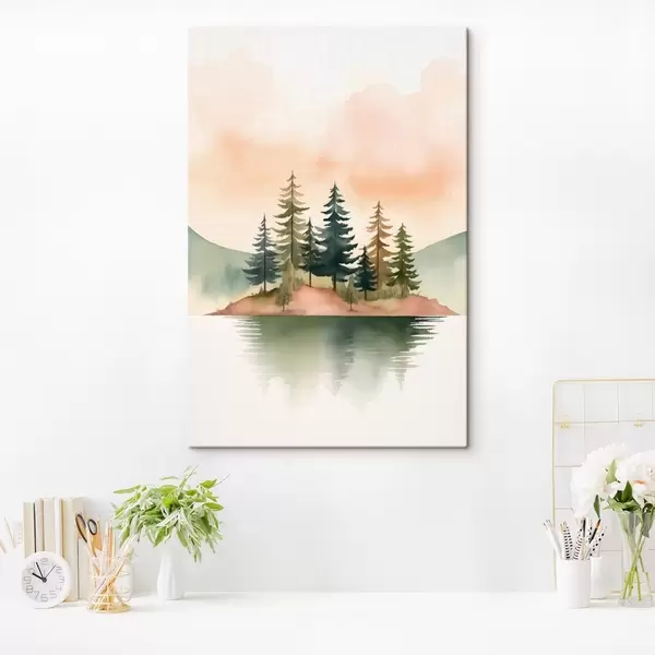 Pictură pe pânză Pini acuarelați pe o insuliță încețoșată, cerul de culoarea piersicii Nr s46505