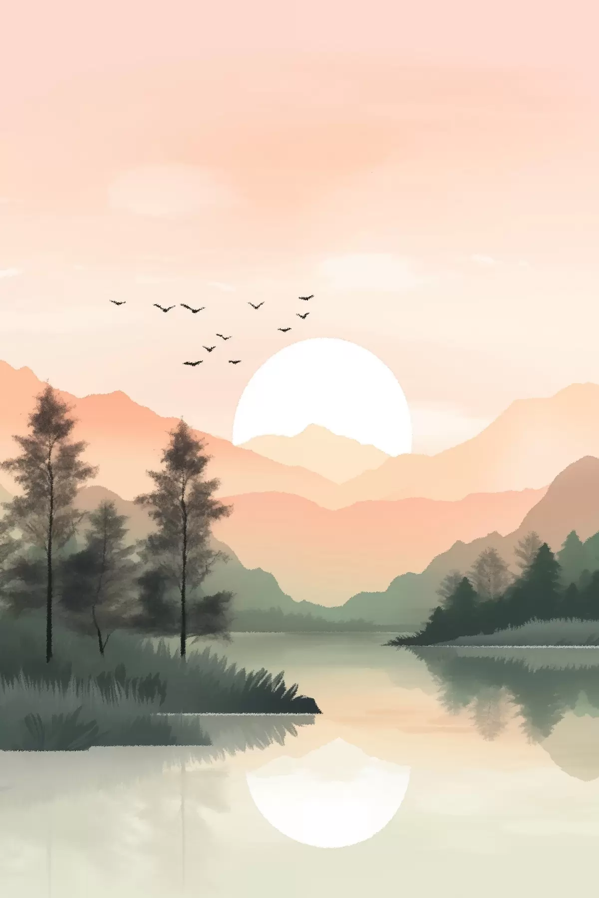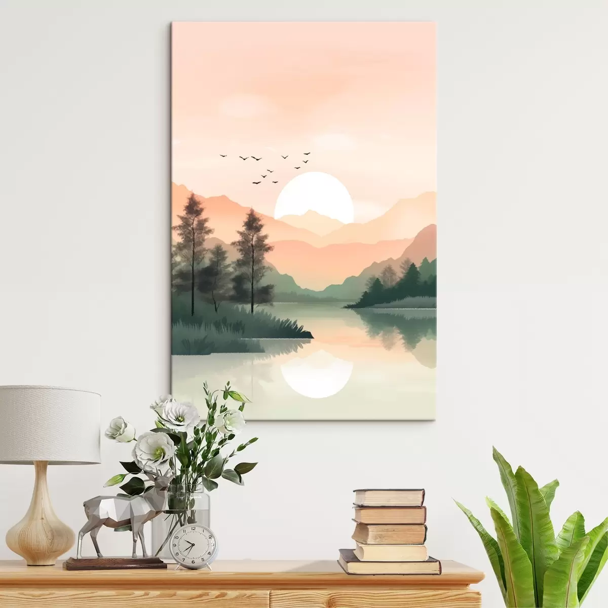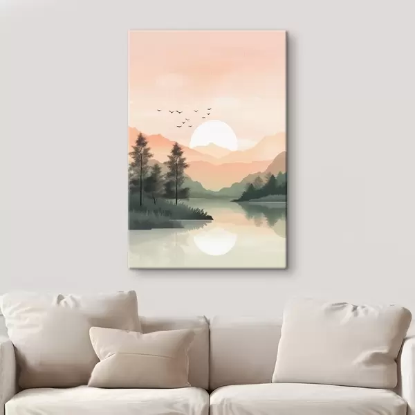 Pictură pe pânză Apus de soare pastelat peste un lac liniștit, cu dealuri îndepărtate și păsări Nr s46508