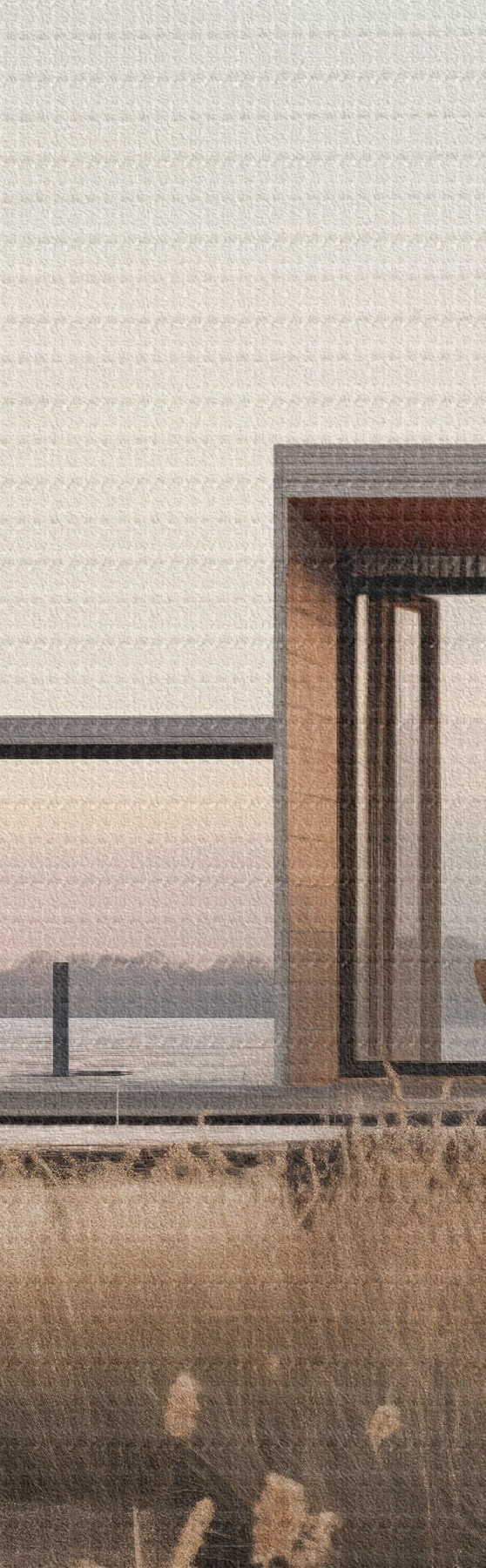 Tablouri Cabana modernă lângă lac, printre stufărișuri, în amurgul blând s46513