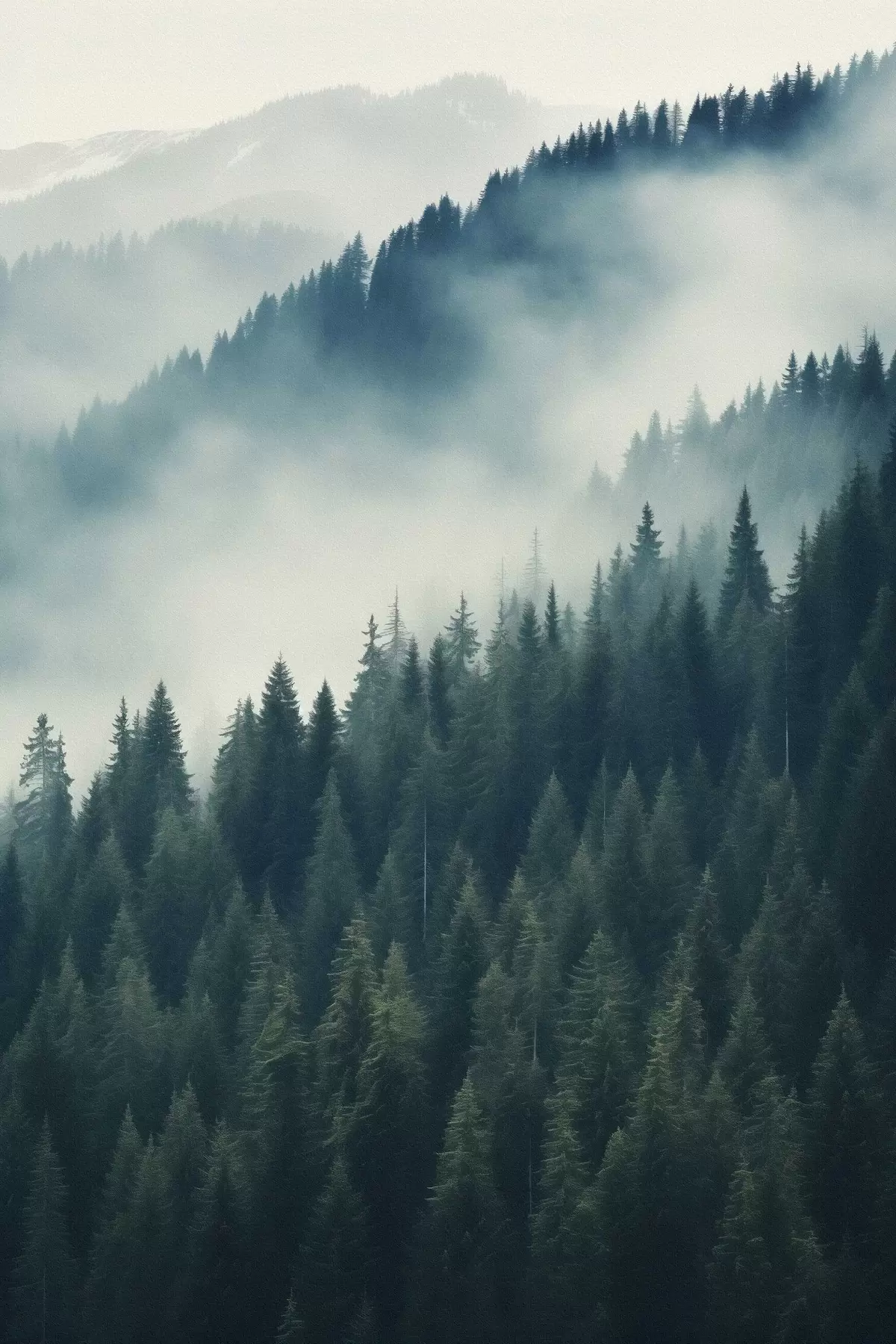 Tablouri Ceață peste versanții acoperiți de conifere, nuanțe de verde intens s46516