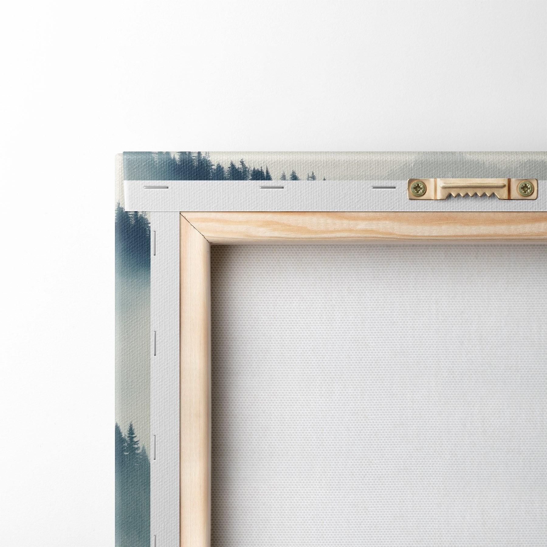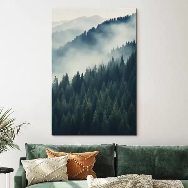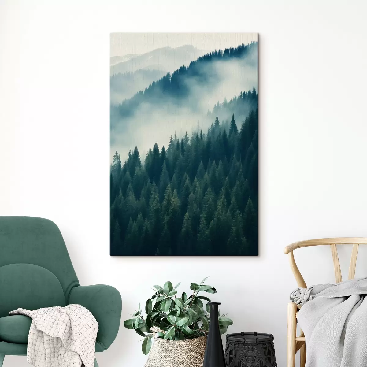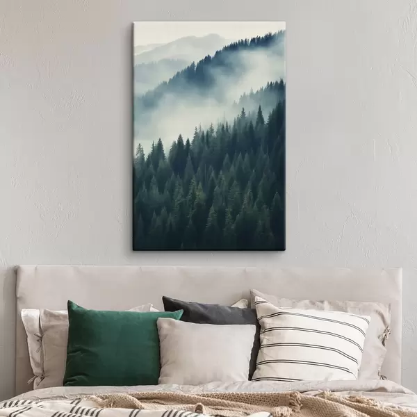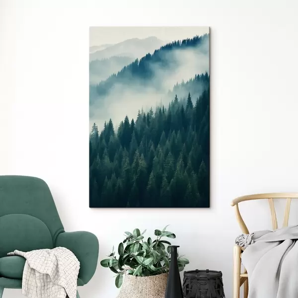 Pictură pe pânză Ceață peste versanții acoperiți de conifere, nuanțe de verde intens Nr s46516