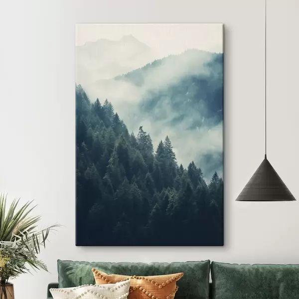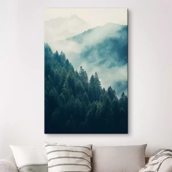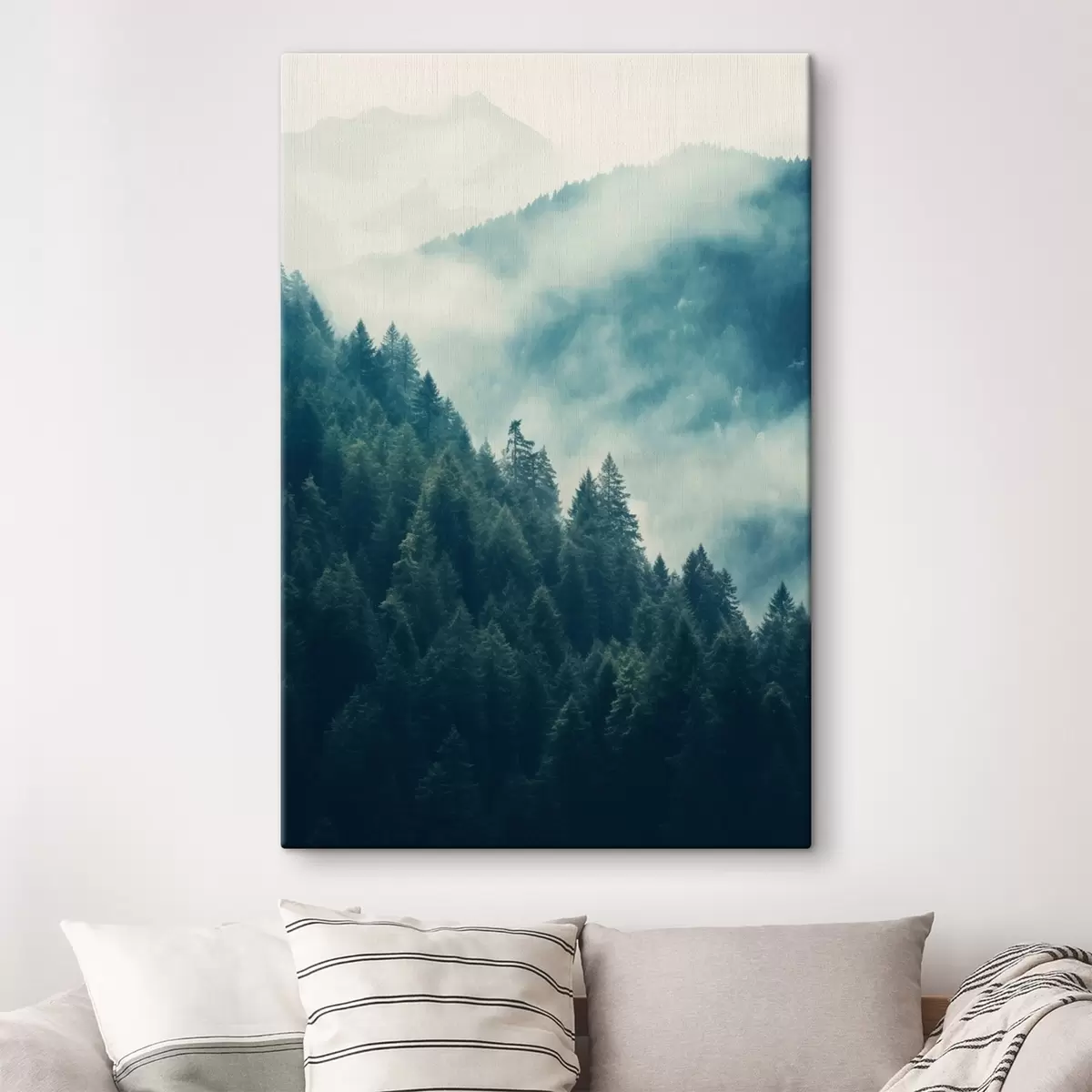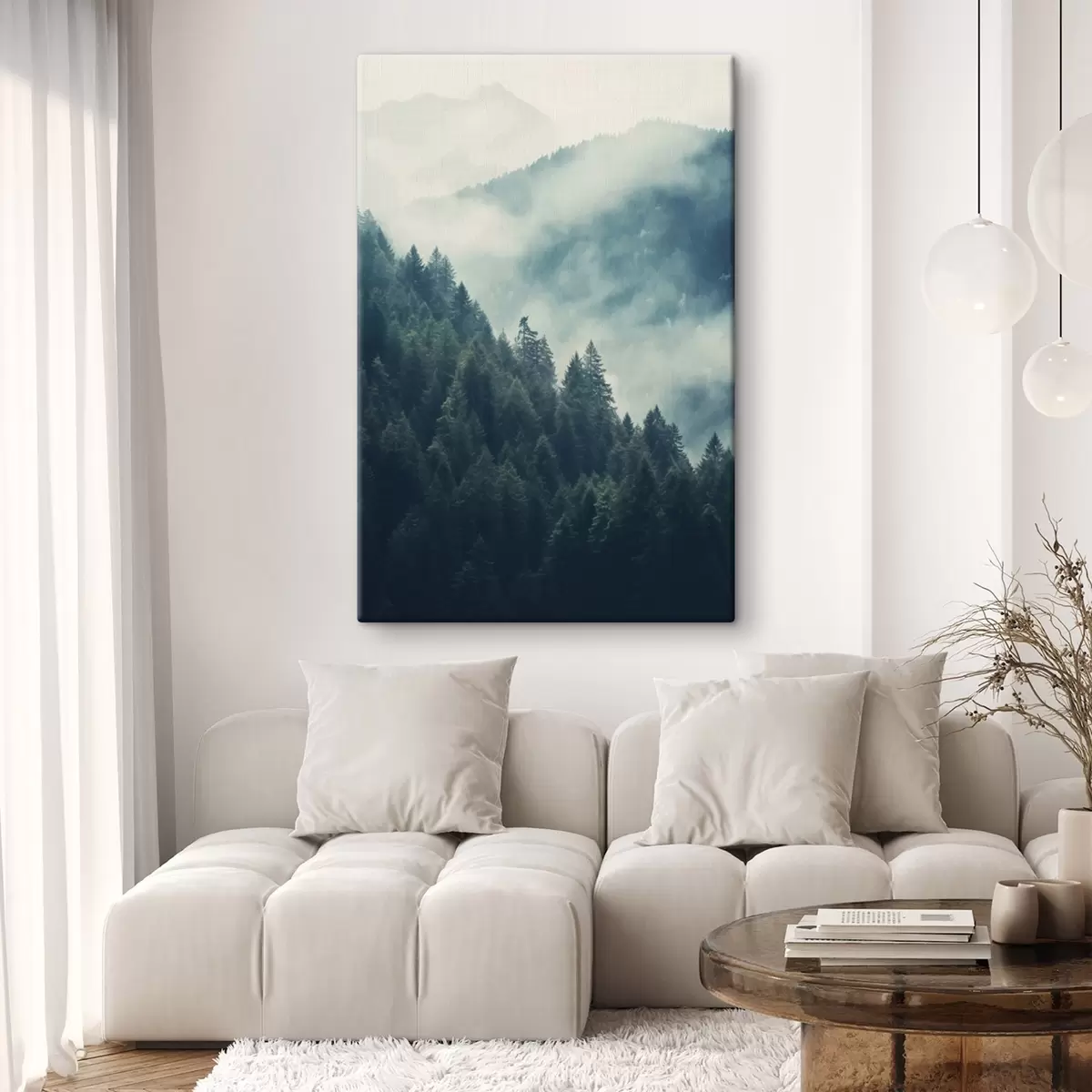 Pictură pe pânză Creaste de munte cețoase și pădure întunecată de conifere Nr s46518