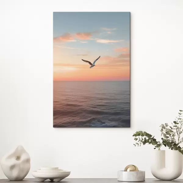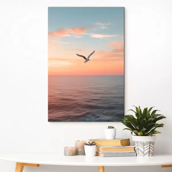 Pictură pe pânză Pescăruș deasupra mării la un apus roz-piersic Nr s46520