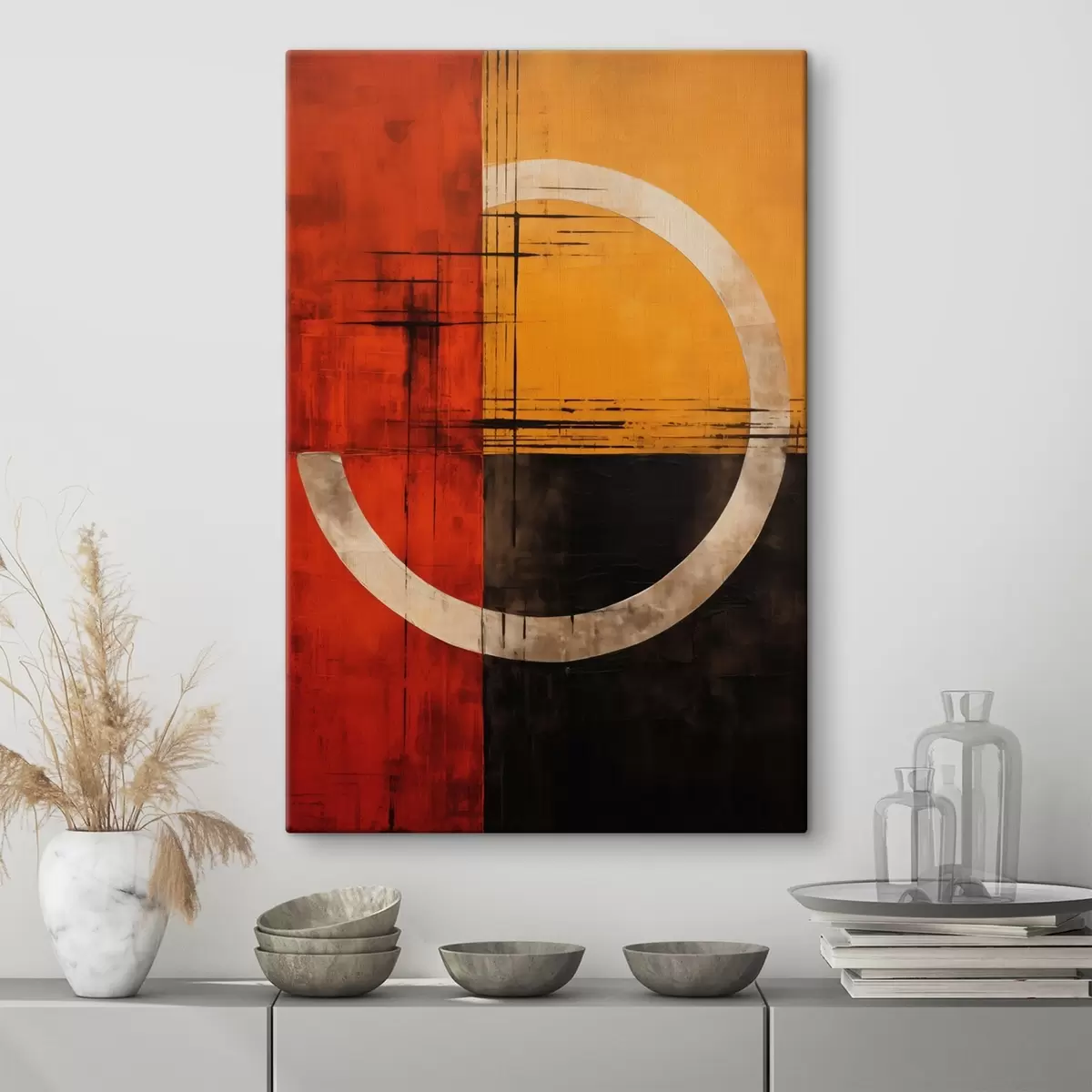 Pictură pe pânză Cerc abstract pe fundal roșu-negru cu linii Nr s46535