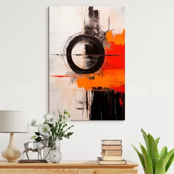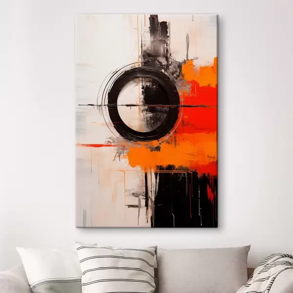 Pictură pe pânză Cerc negru pe fond alb, cu linii și pete portocalii Nr s46549