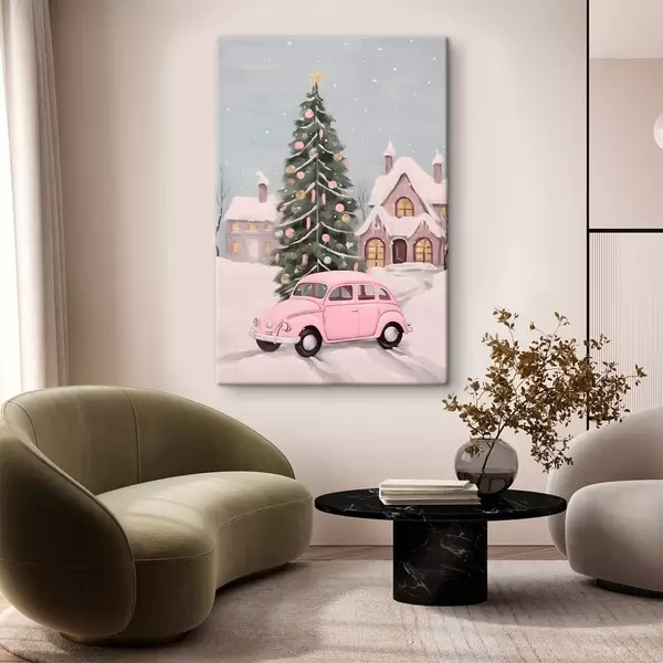 Pictură pe pânză Mașină roz și brad de Crăciun împodobit în fața casei Nr s46621