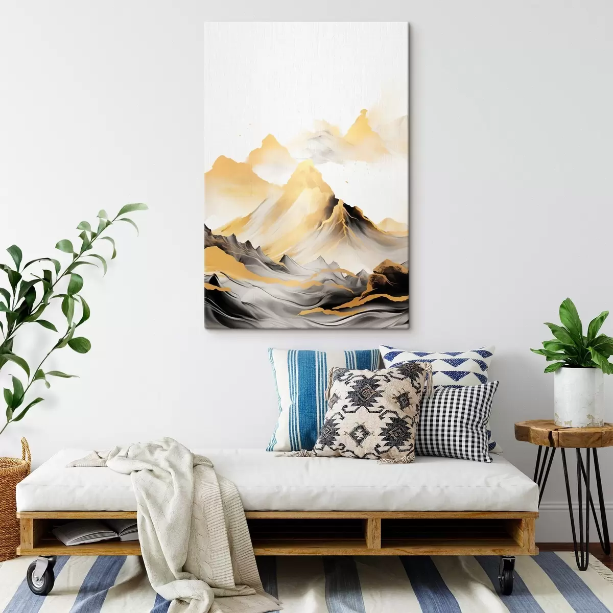 Tablouri Munți texturați galbeni și negri cu vârfuri înzăpezite, stil de pictură cu tuș, lanț muntos minimalist s46684