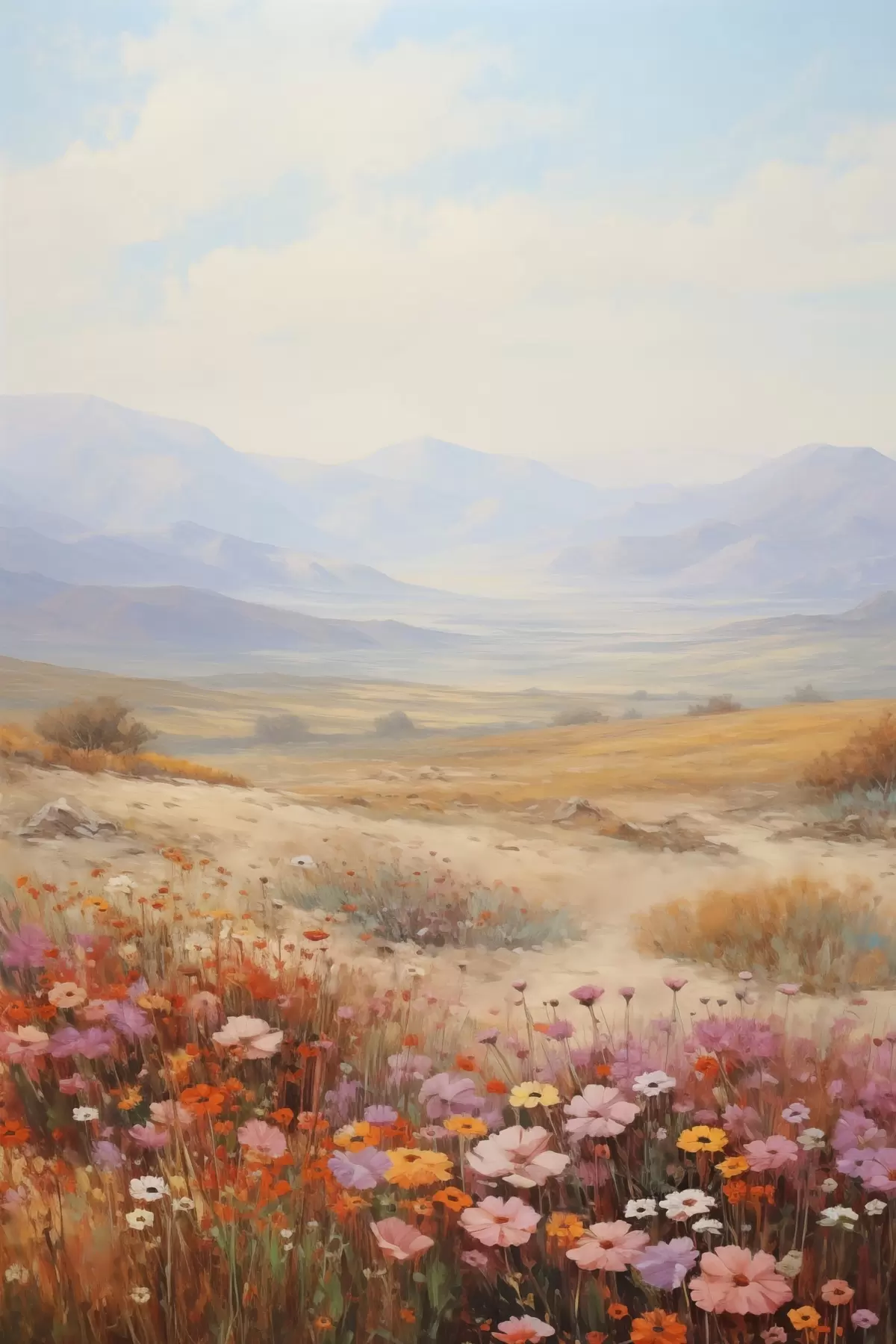 Tablouri Peisaj, un câmp cu flori colorate și munți în fundal, culori delicate și pastelate s46685