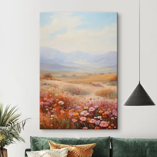 Pictură pe pânză Peisaj, un câmp cu flori colorate și munți în fundal, culori delicate și pastelate Nr s46685