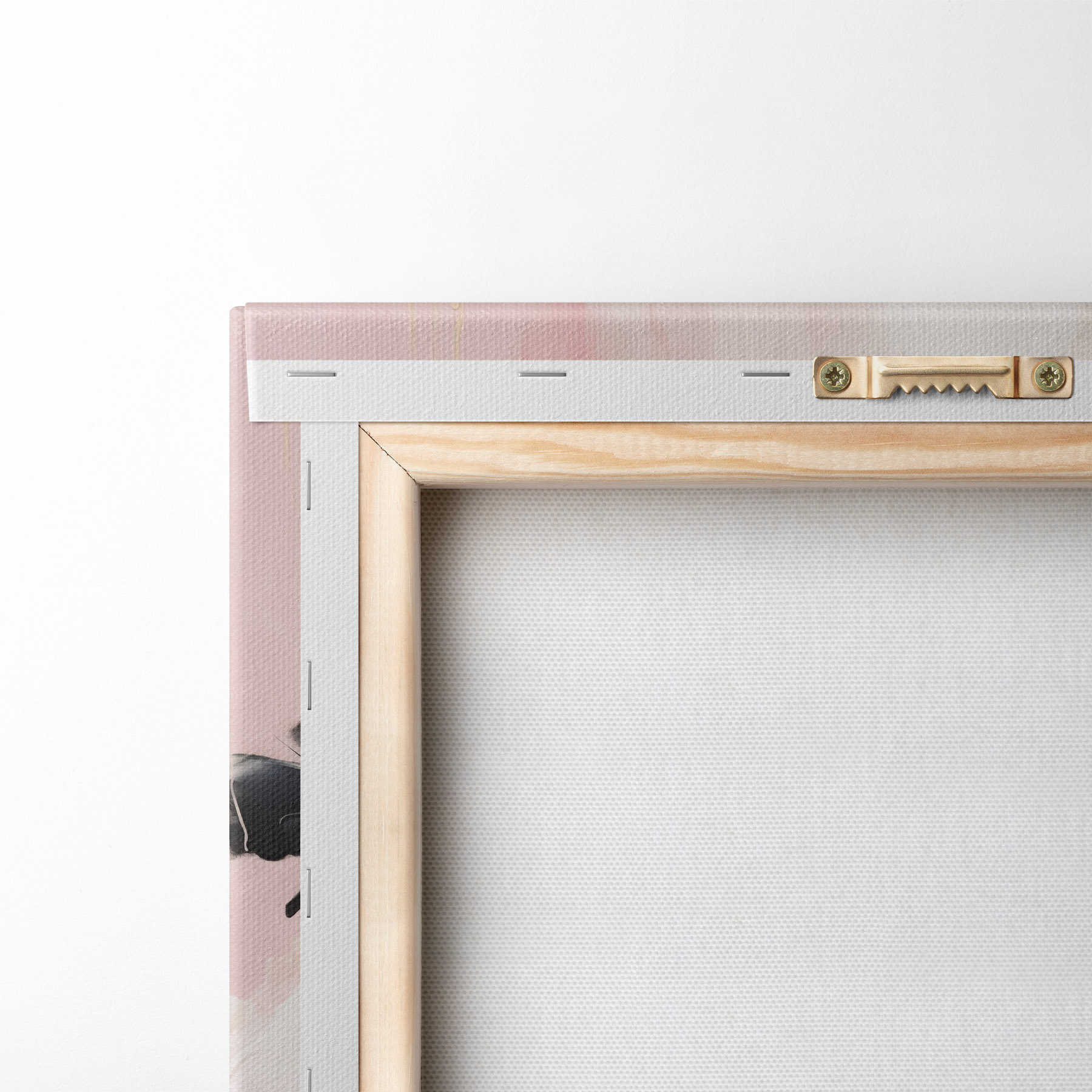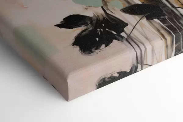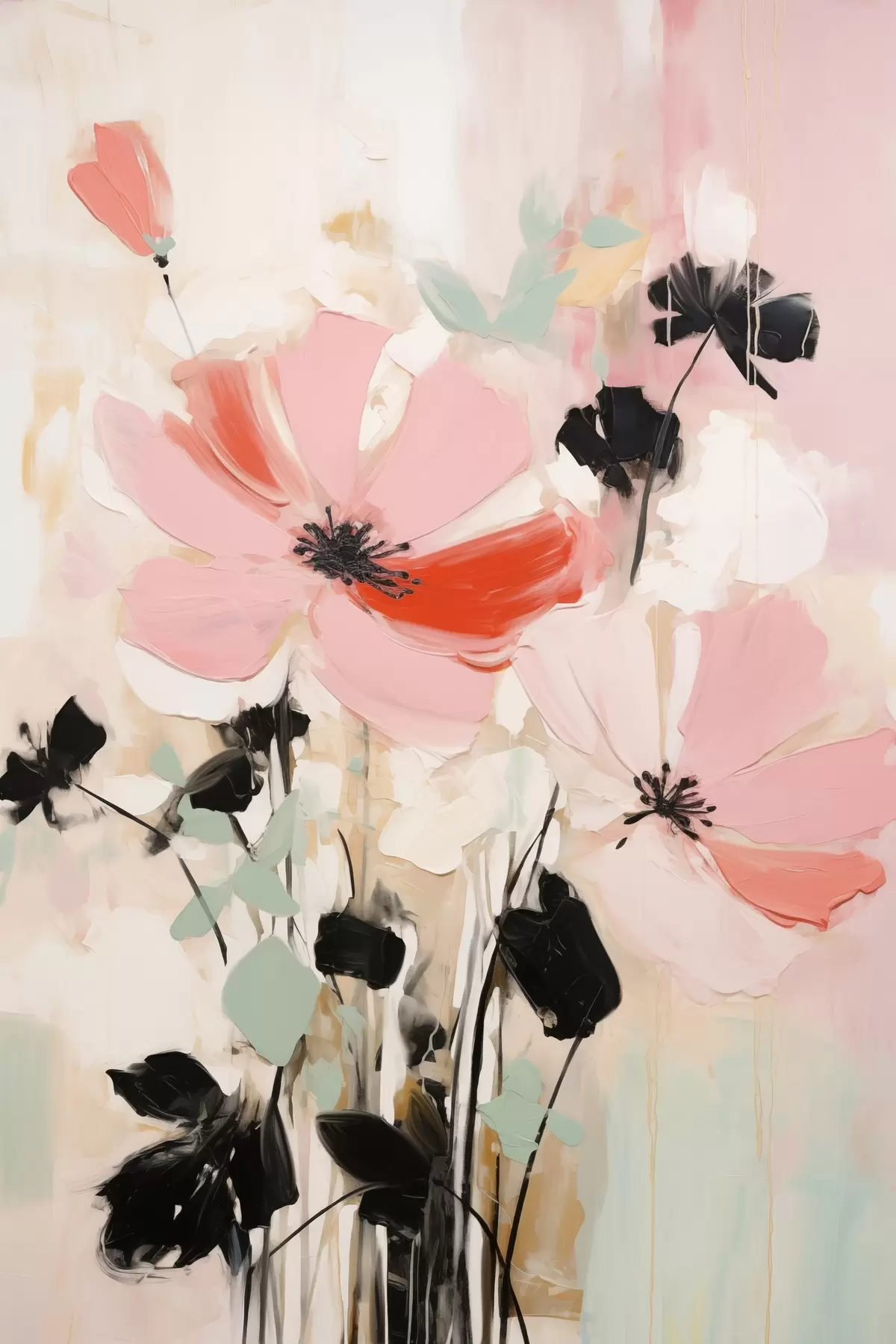 Pictură pe pânză Flori roz și negre cu frunze, culori pastelate delicate, aranjament floral abstract, artă minimalistă Nr s46687